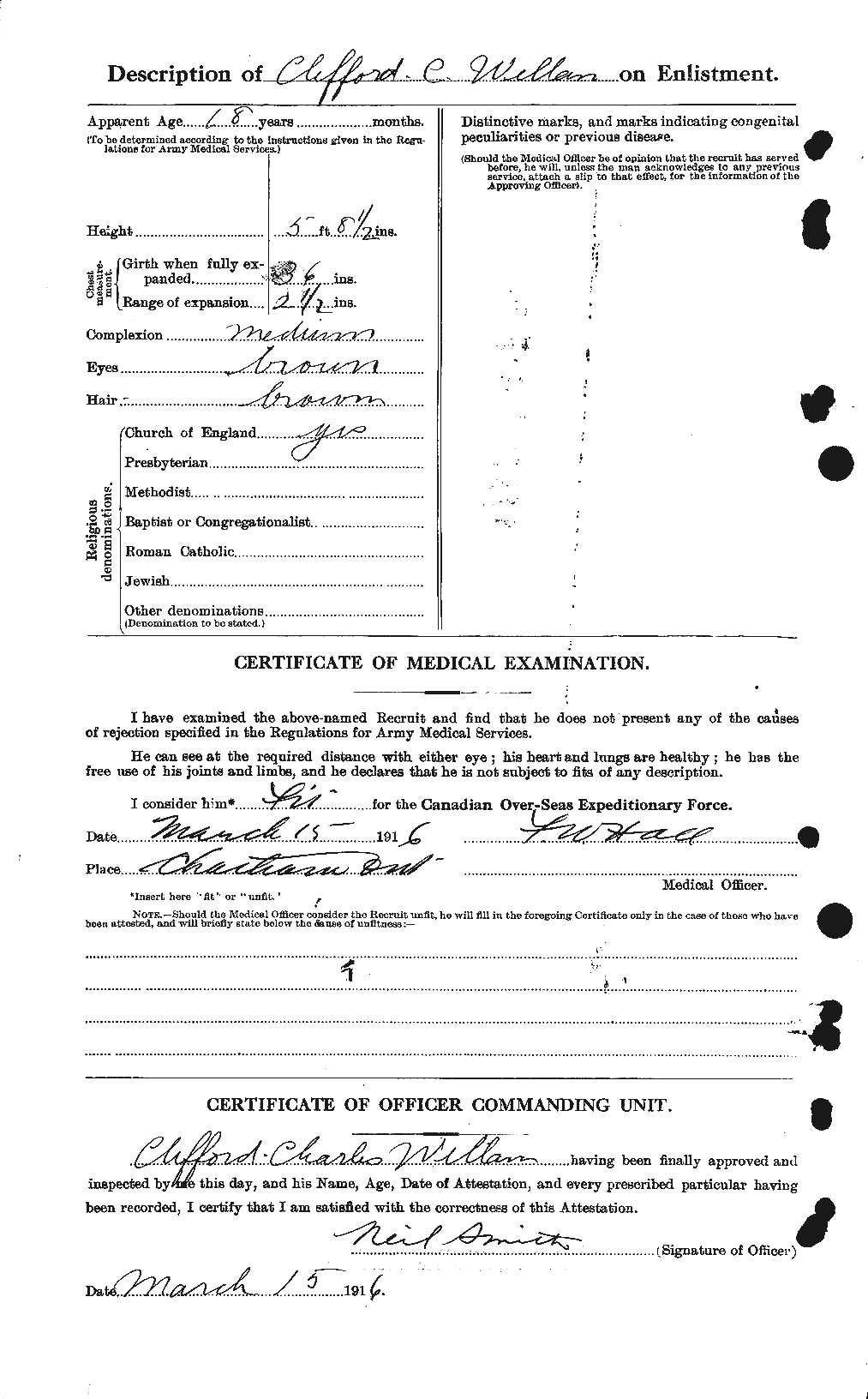 Family Search: When Private Clifford Charles Willan was born on 17 March 1899, in Mersea Township, Essex, Ontario, Canada, his father, Thomas James Willan, was 24 and his mother, Alice Hooker, was 24. He lived in Wheatley, Kent, Ontario, Canada in 1916. He registered for military service in 1916. In 1916, at the age of 17, his occupation is listed as farmer in Wheatley, Kent, Ontario, Canada. He died on 24 August 1917, in Lozinghem, Pas-de-Calais, Hauts-de-France, France, at the age of 18, and was buried in Lapugnoy Military Cemetery, Lapugnoy, Pas-de-Calais, Nord-Pas-de-Calais, France.