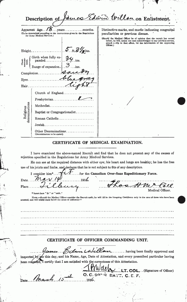 Family Search: When Private James Edwin Willan was born on 17 April 1899, in Staples, Leamington, Essex, Ontario, Canada, his father, Isaac Hugh Willan, was 37 and his mother, Etta Samantha Hooker, was 33. He lived in Essex, Ontario, Canada in 1911. He registered for military service in 1916. In 1916, at the age of 17, his occupation is listed as farmer in Staples, Leamington, Essex, Ontario, Canada. He died on 26 August 1918, in Vis-en-Artois, Pas-de-Calais, Nord-Pas-de-Calais, France, at the age of 19, and was buried in Tilloy-lès-Mofflaines, Pas-de-Calais, Nord-Pas-de-Calais, France.