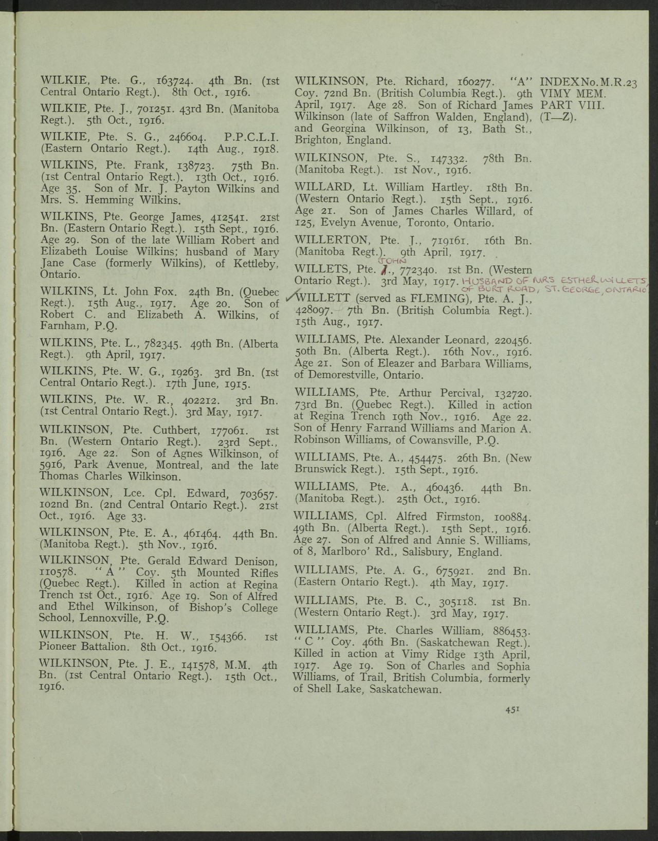Willard’s brother James Willard enlisted and served with the Canadian Army Medical Corps. He survived the War. His step-brother Arnold also enlisted and survived the War. Willard’s uncle, William Richard Willard, also enlisted and survived the War.