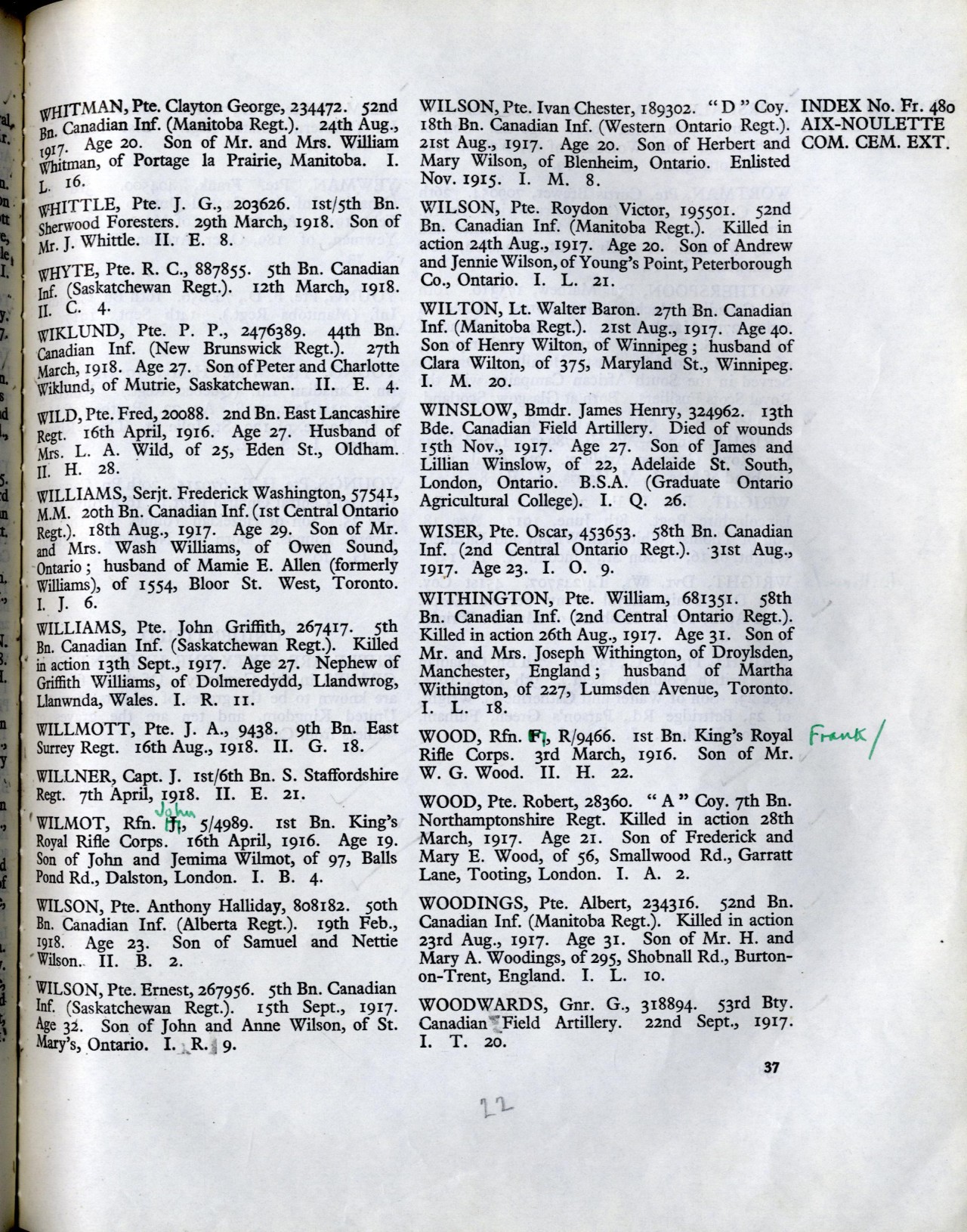 Family Search: When Private Ivan Chester Wilson was born on 10 November 1896, in Detroit, Wayne, Michigan, United States, his father, Herbert Sterliine Wilson, was 31 and his mother, Mary Deborah Wixon, was 28. He lived in Wayne, Michigan, United States in 1896 and Kent, Ontario, Canada in 1911. He registered for military service in 1915. In 1915, at the age of 19, his occupation is listed as painter in Blenheim, Kent, Ontario, Canada. He died on 21 August 1917, in Lens, Pas-de-Calais, France, at the age of 20, and was buried in Aix-Noulette, Pas-de-Calais, France.