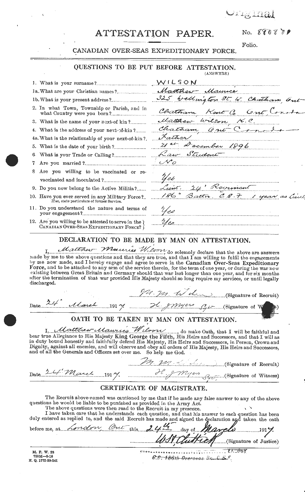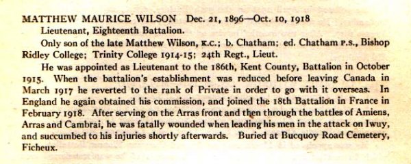 Family Search: When Lieutenant Matthew Maurice Wilson was born on 21 December 1896, in Chatham, Kent, Ontario, Canada, his father, Mathew Wilson KC, was 42 and his mother, Anna Marsden Atkinson, was 37. He lived in Ontario, Canada in 1896 and Kent, Ontario, Canada in 1911. He registered for military service in 1917. In 1917, at the age of 21, his occupation is listed as law student in Toronto, Ontario, Canada. He died on 10 October 1918, in Ficheux, Pas-de-Calais, Nord-Pas-de-Calais, France, at the age of 21, and was buried in Bucquoy, Pas-de-Calais, Nord-Pas-de-Calais, France.