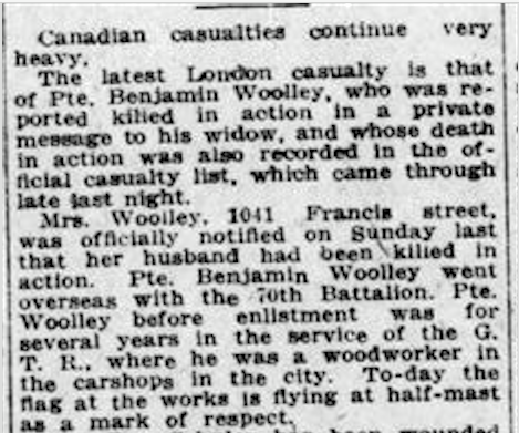 Family Search: When Private Benjamin Woolley was born on 10 June 1891, in Barrow in Furness, Lancashire, England, his father, Benjamin Woolley, was 30 and his mother, Ann Maria Groves, was 28. He married Lily Huddard on 22 August 1914, in London, Ontario, Canada West, British Colonial America. They were the parents of at least 1 daughter. He immigrated to Quebec City, Quebec, Canada in 1913 and lived in Barrow in Furness, Lancashire, England, United Kingdom for about 10 years and London, Ontario, Canada in 1915. He registered for military service in 1915. In 1915, at the age of 24, his occupation is listed as wood machinist. He died on 9 April 1917, in Thélus, Pas-de-Calais, Nord-Pas-de-Calais, France, at the age of 25, and was buried in Thélus, Pas-de-Calais, Nord-Pas-de-Calais, France.