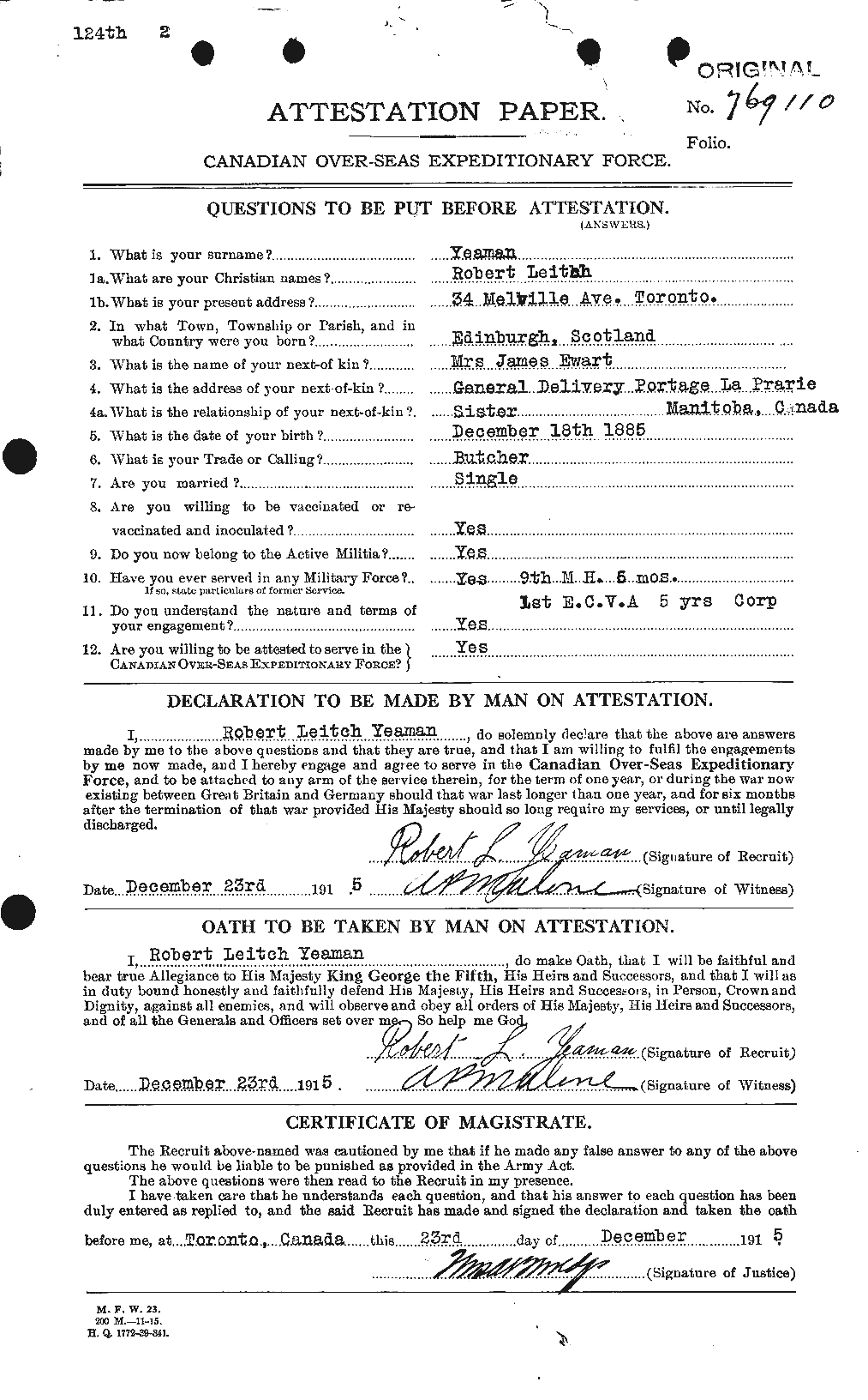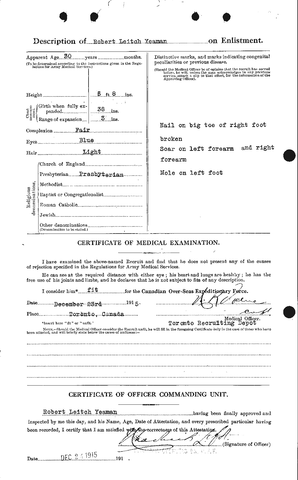 #004139-16 – Robert Leitch YEAMAN, 30, soldier, Edinburgh, Toronto, s/o David YEAMAN & Catherine LEITCH, married Agnes Jane Gray RUSSELL, 31, Dundee Scotland, Toronto, d/o John Scott RUSSELL & Jane GRAY, witn: L.H. YEO of 400 Indian Rd & Miss A.L. HARRIS of 576 Sherbourne St., 1 June 1916