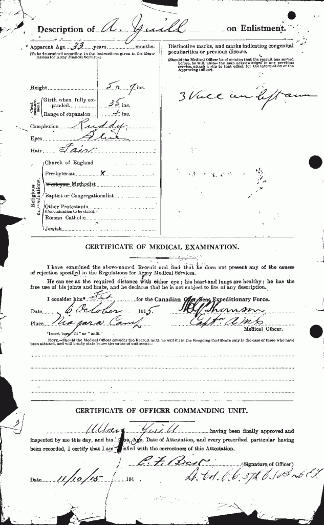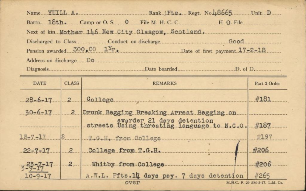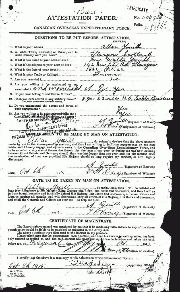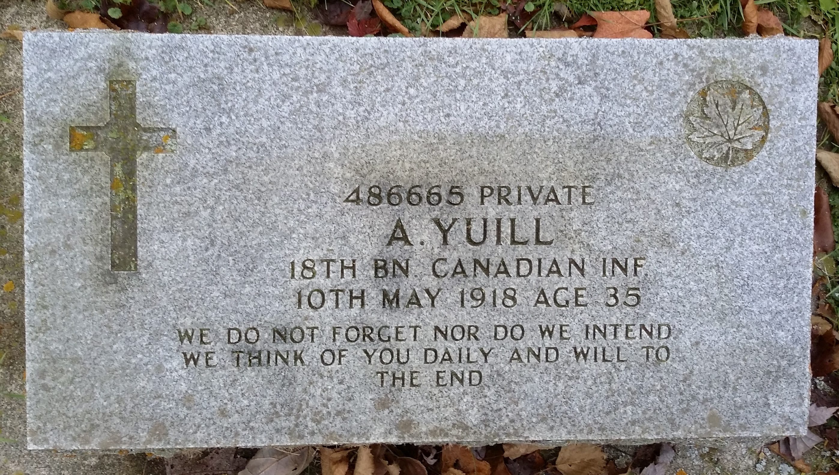 Family Search: Private Allan Yuill was born on 22 October 1882, in Glasgow Green, Glasgow, Scotland, United Kingdom. He immigrated to Canada in 1913. He registered for military service in 1915. In 1915, at the age of 33, his occupation is listed as fireman. He died on 10 May 1918, in Port Arthur, Thunder Bay, Ontario, Canada, at the age of 35, and was buried in Mountain View Cemetery, Thunder Bay, Thunder Bay, Ontario, Canada.