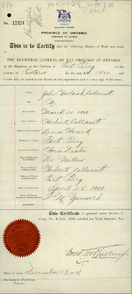 Return of Birth issued to establish the true age of this man. It indicates he was born March 20, 1900 to Herbert and Lena Collacutt of Port Perry. His father is a horse dealer and the attending physician to the birth was Dr. Mellow. Registration of the birth, April 25, 1900 by J.M. Yarnold.