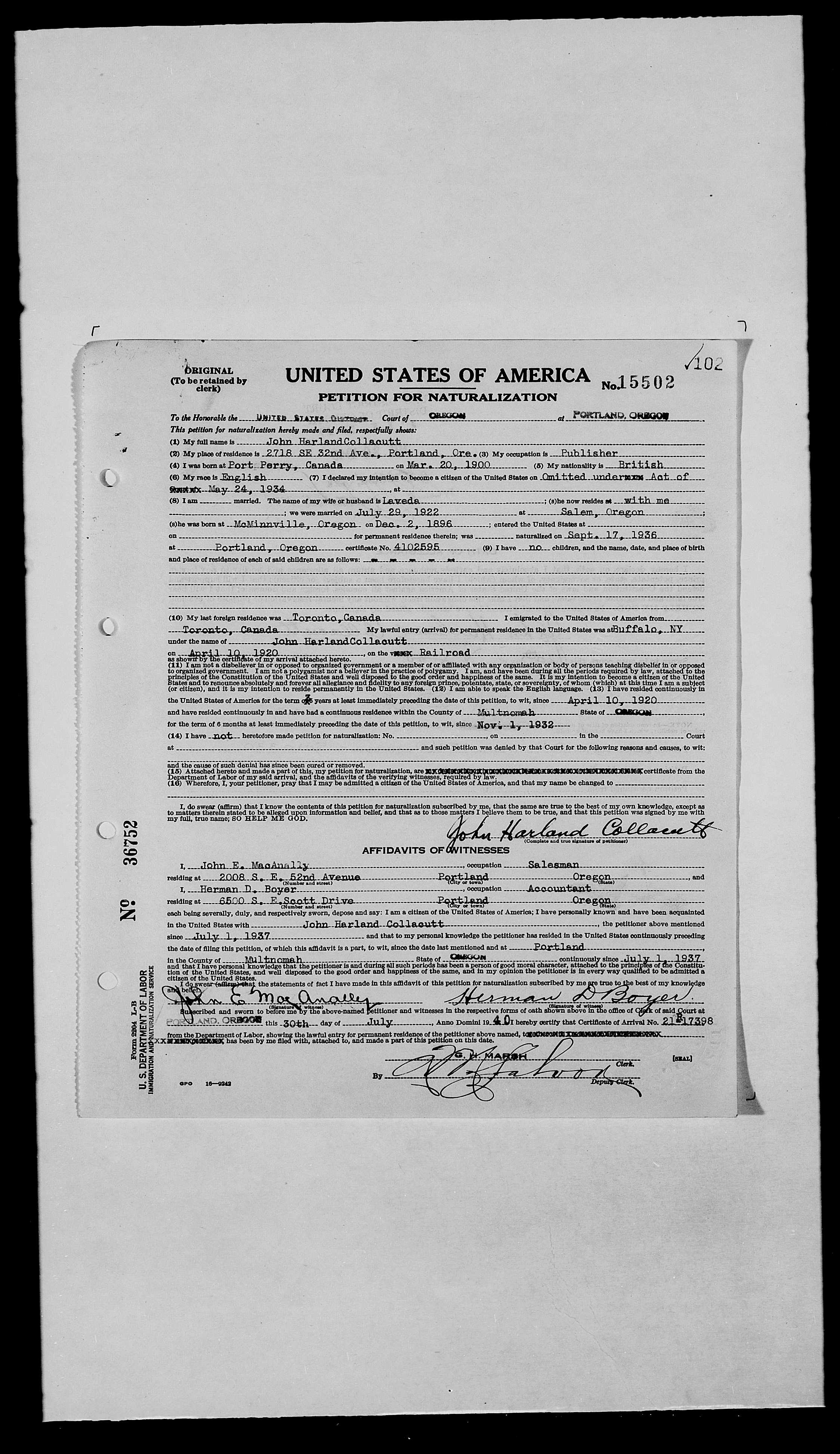 Embarked England to Canada aboard the S.S. Aquitania.