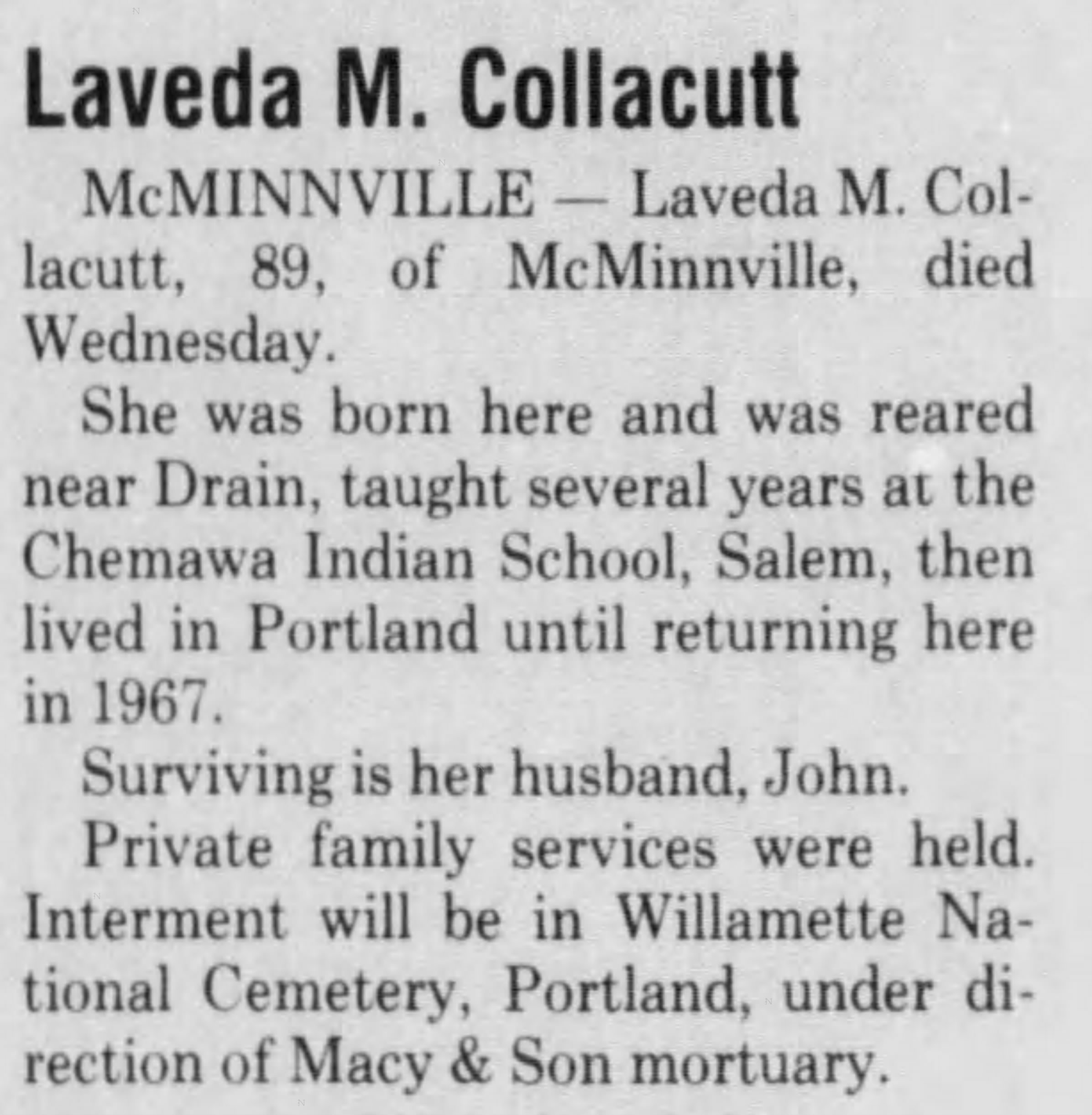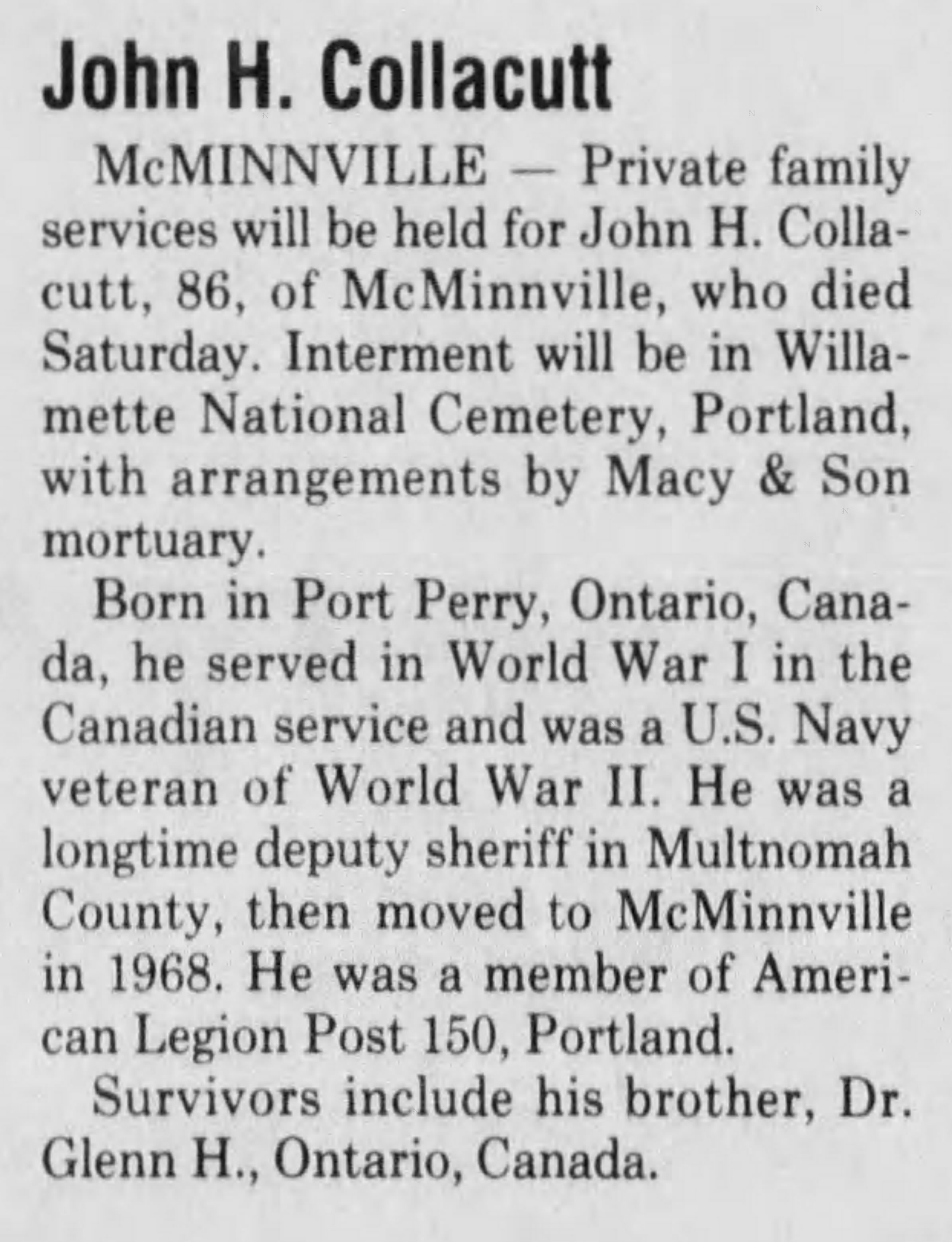 Dies while residing at Mcminnville, Yamhill, Oregon. Interned at Willamette National Cemetery Portland, Multnomah County, Oregon, USA. PLOT: Section COL-1 ROW K Site 313. Joined by his wife, Laveda Marguerite Wright Collacutt (died October 29, 1986).