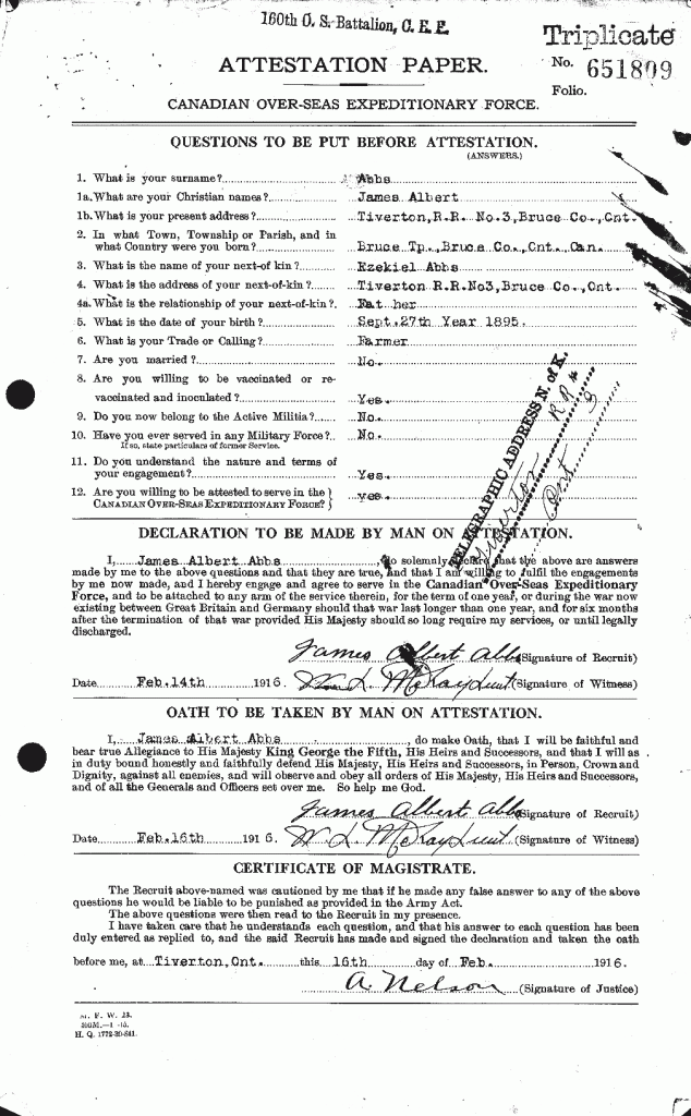 Source: Bruce Remembers. Served temporarily with the 18th until transferred to 43rd Battalion.