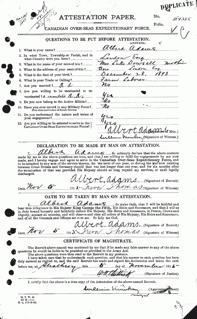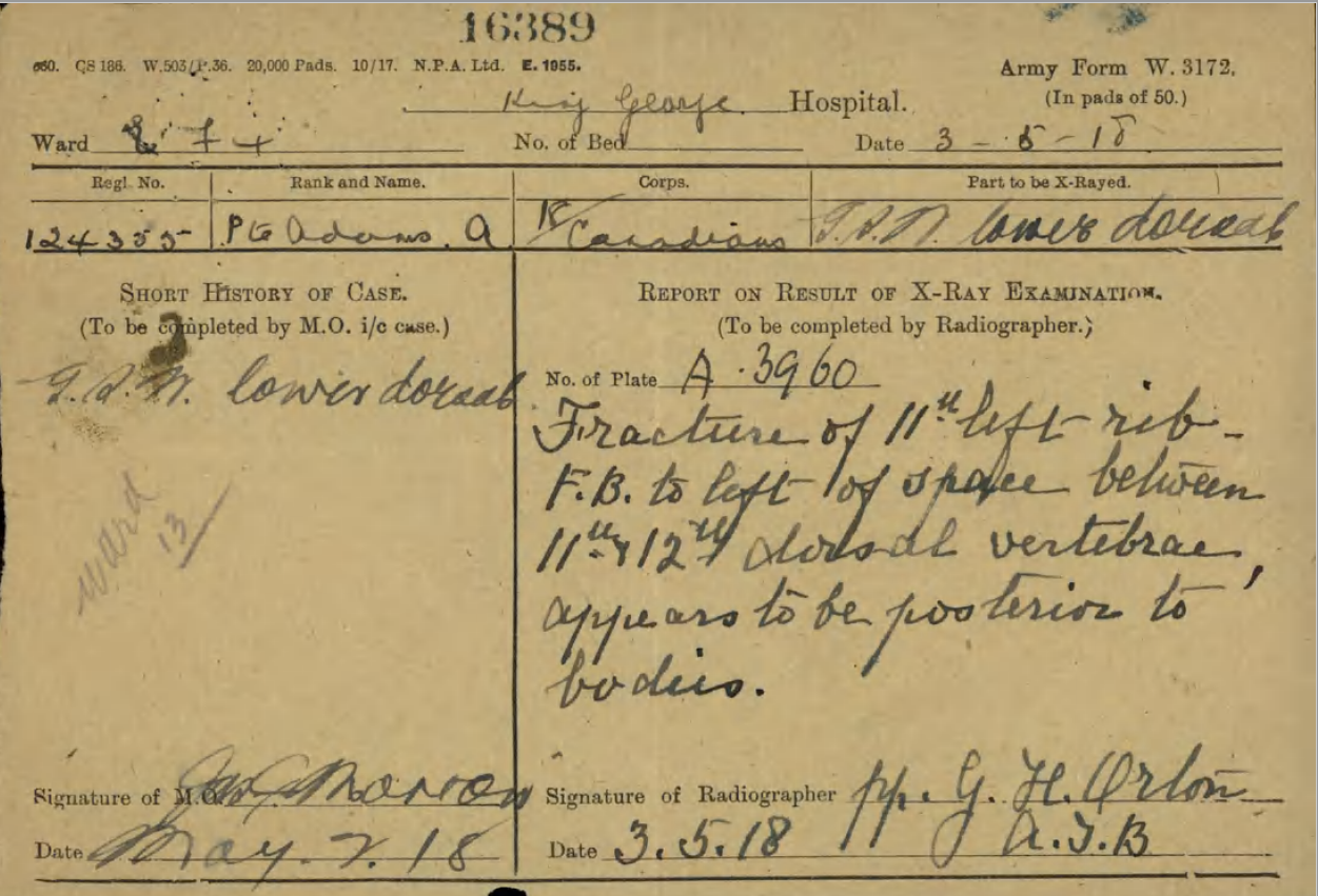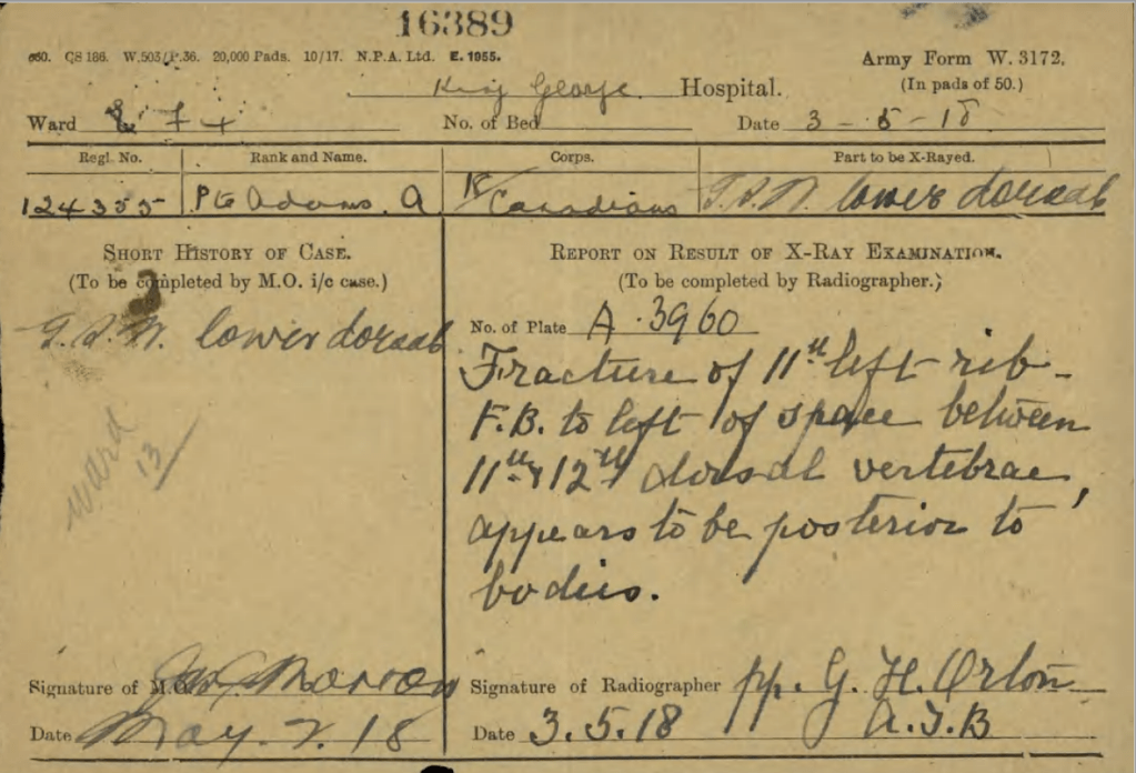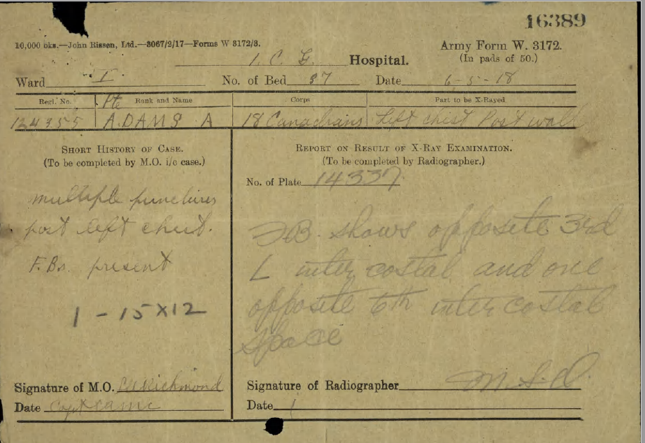 He was wounded July 22, 1917, returned to service on the 28th attached to the 4th Canadian Trench Mortar Battery and then returned to the 18th Battalion on October 12, 1917. He served with the Battalion until April 2, 1918, when he was wounded and sent to England to recover from his wounds.