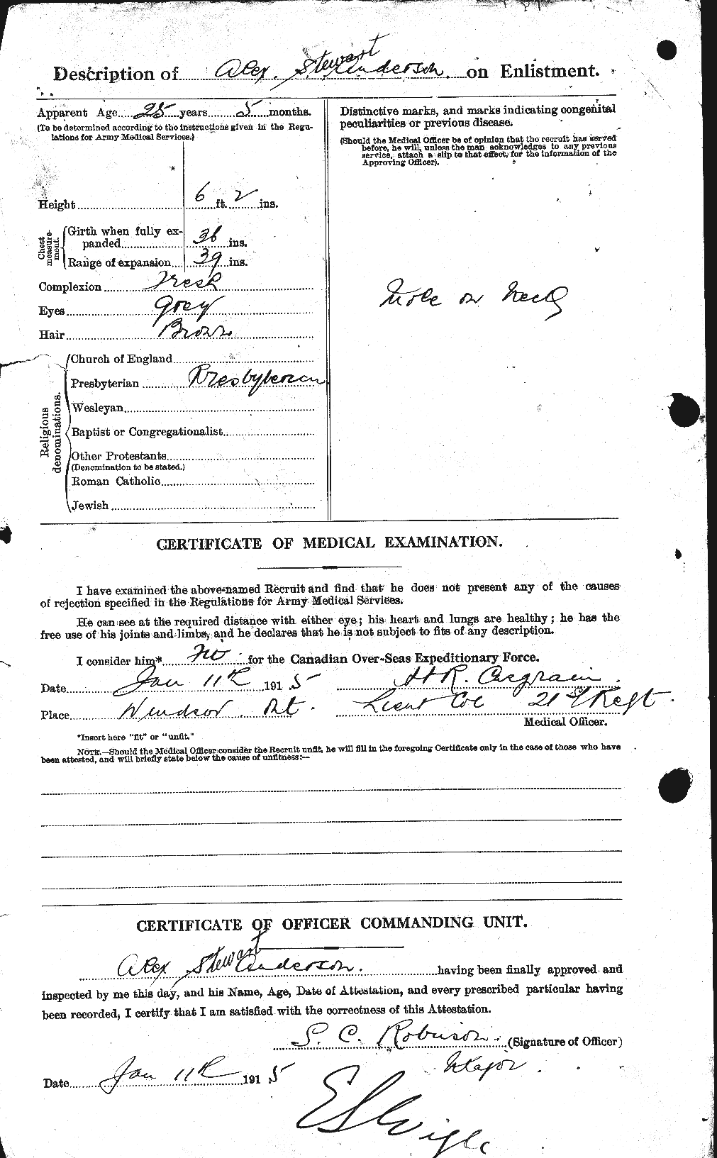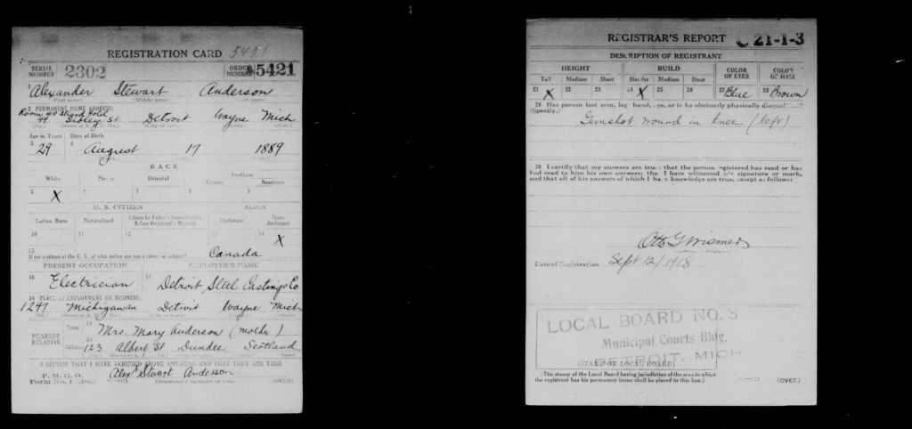 Family Search: When Alexander Stewart Anderson was born on 17 August 1890, in Montrose, Angus, Scotland, United Kingdom, his father, Peter Stewart Anderson, was 26 and his mother, Mary Ann Jolly, was 26. He had at least 1 son and 1 daughter with Jean Bell Scott. He lived in Dundee, Forfarshire, Scotland, United Kingdom in 1901 and Detroit, Wayne, Michigan, United States for about 1 years. He registered for military service in 1915. In 1915, at the age of 25, his occupation is listed as electrician in Detroit, Wayne, Michigan, United States. He died on 4 May 1935, in Dundee, Scotland, United Kingdom, at the age of 44, and was buried in Dundee Eastern Cemetery, Dundee, Scotland, United Kingdom.