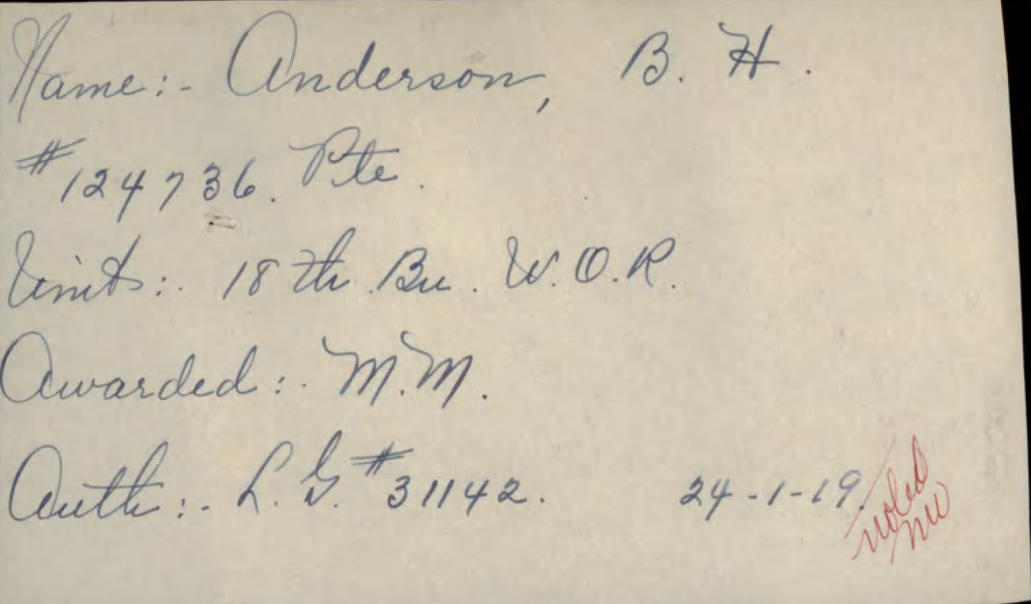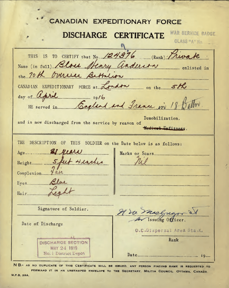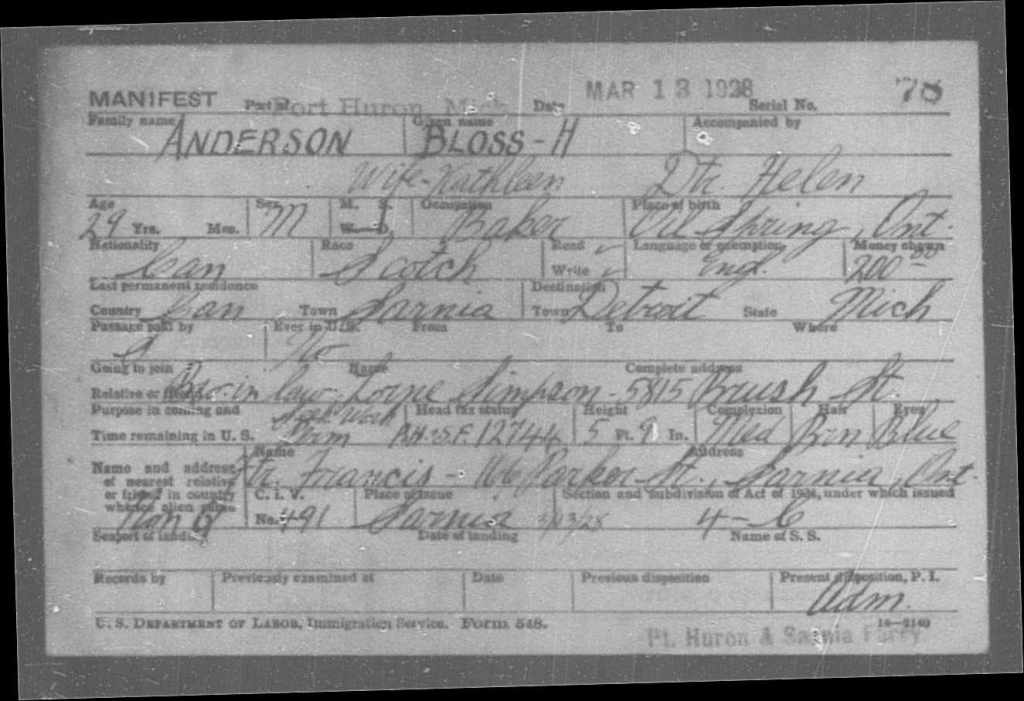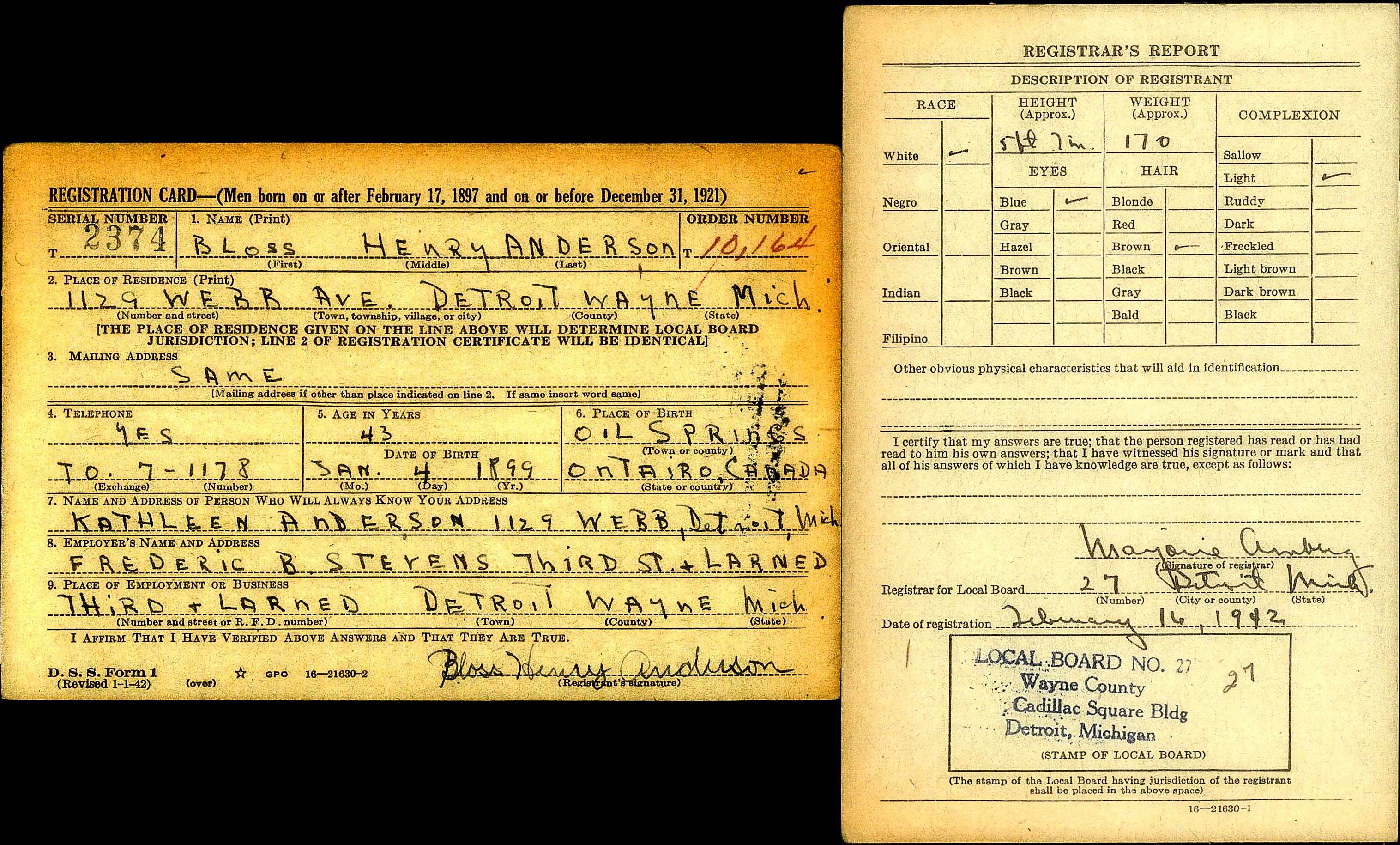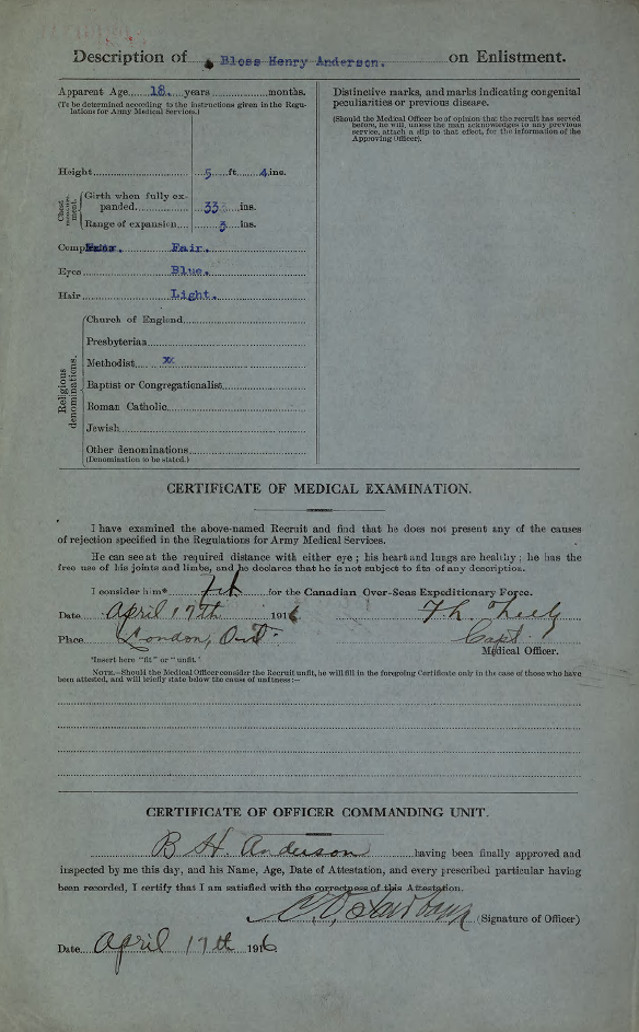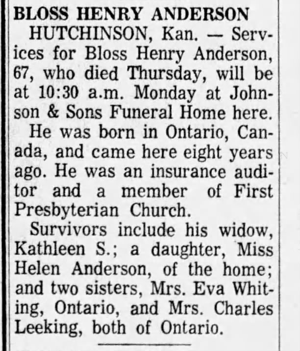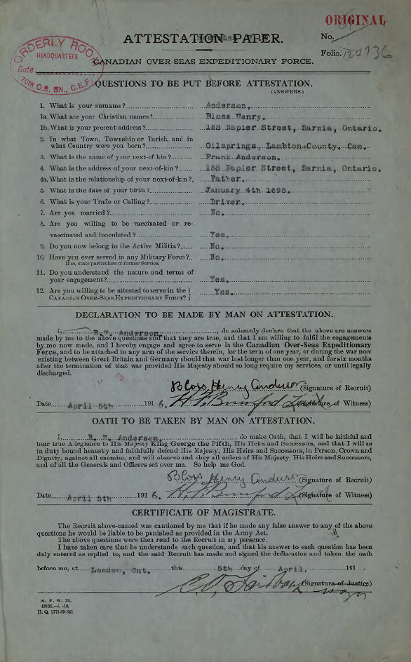 Family Search: When Private Bloss Henry Anderson was born on 4 January 1899, in Oil Springs, Lambton, Ontario, Canada, his father, Francis Smith Anderson, was 41 and his mother, Annie Maria Berry, was 36. He married Kathleen May Simpson on 24 March 1921, in Sarnia, Lambton, Ontario, Canada. They were the parents of at least 1 son and 2 daughters. He immigrated to Port Huron, St. Clair, Michigan, United States in 1941 and lived in Detroit Ward 6, Detroit, Wayne, Michigan, United States in 1940 and Detroit, Wayne, Michigan, United States in 1950. He registered for military service in 1916. In 19, his occupation is listed as driver in Sarnia, Lambton, Ontario, Canada. He died on 18 August 1966, in Hutchinson, Reno, Kansas, United States, at the age of 67, and was buried in Memorial Park Cemetery, Hutchinson, Reno, Kansas, United States.