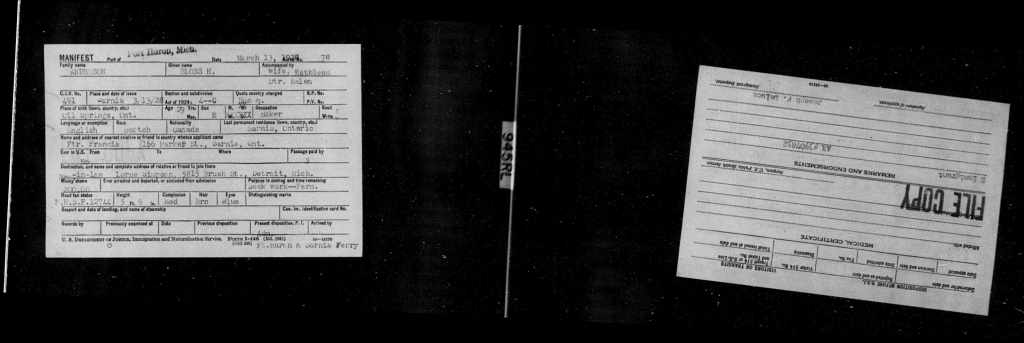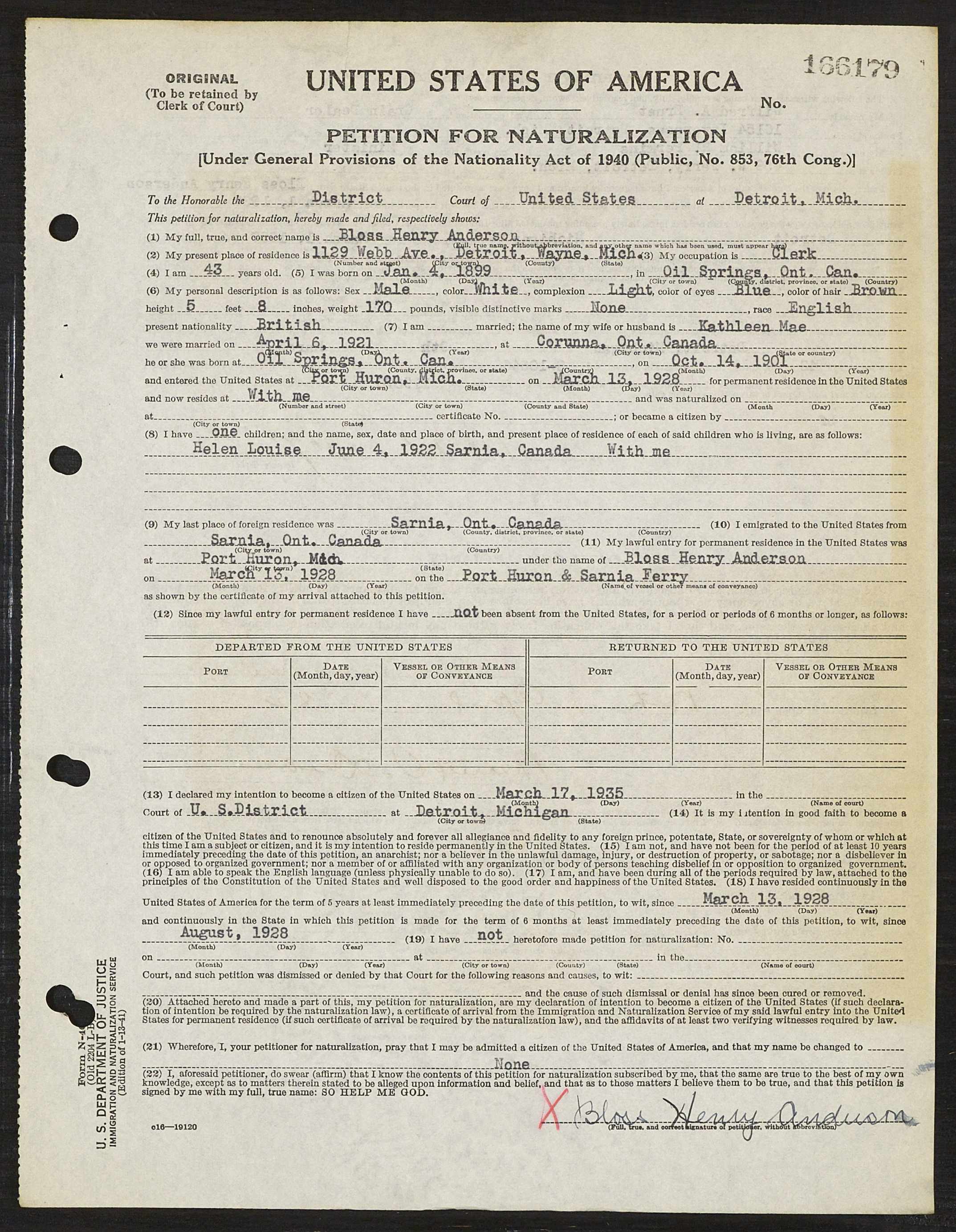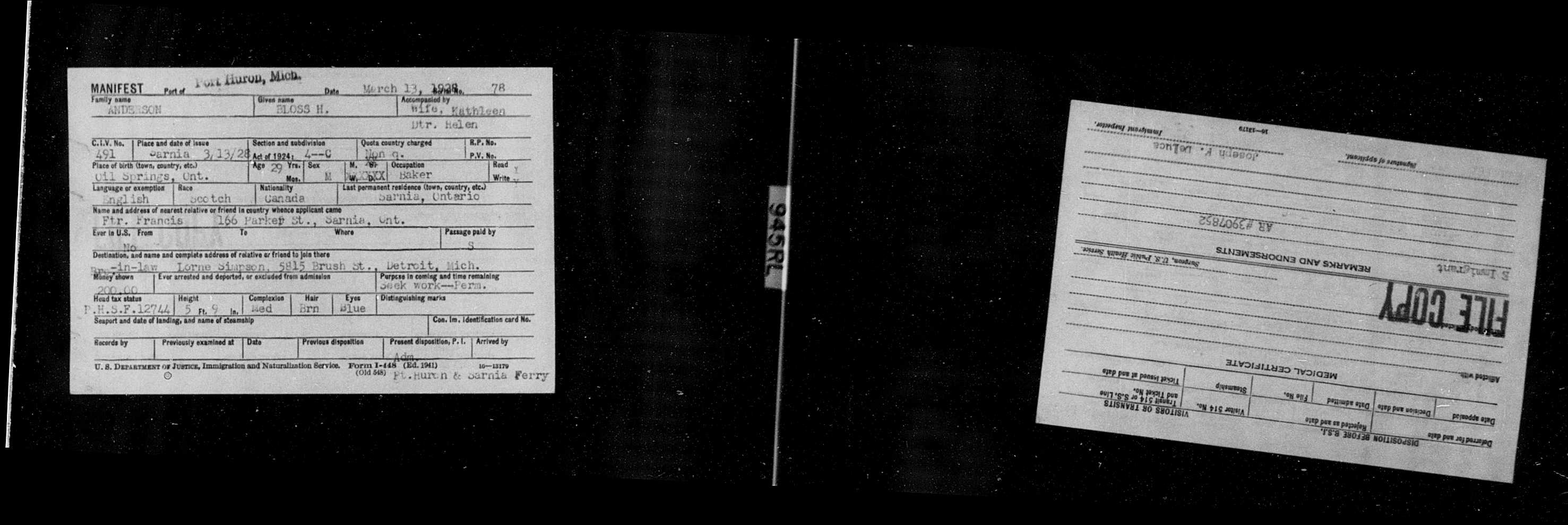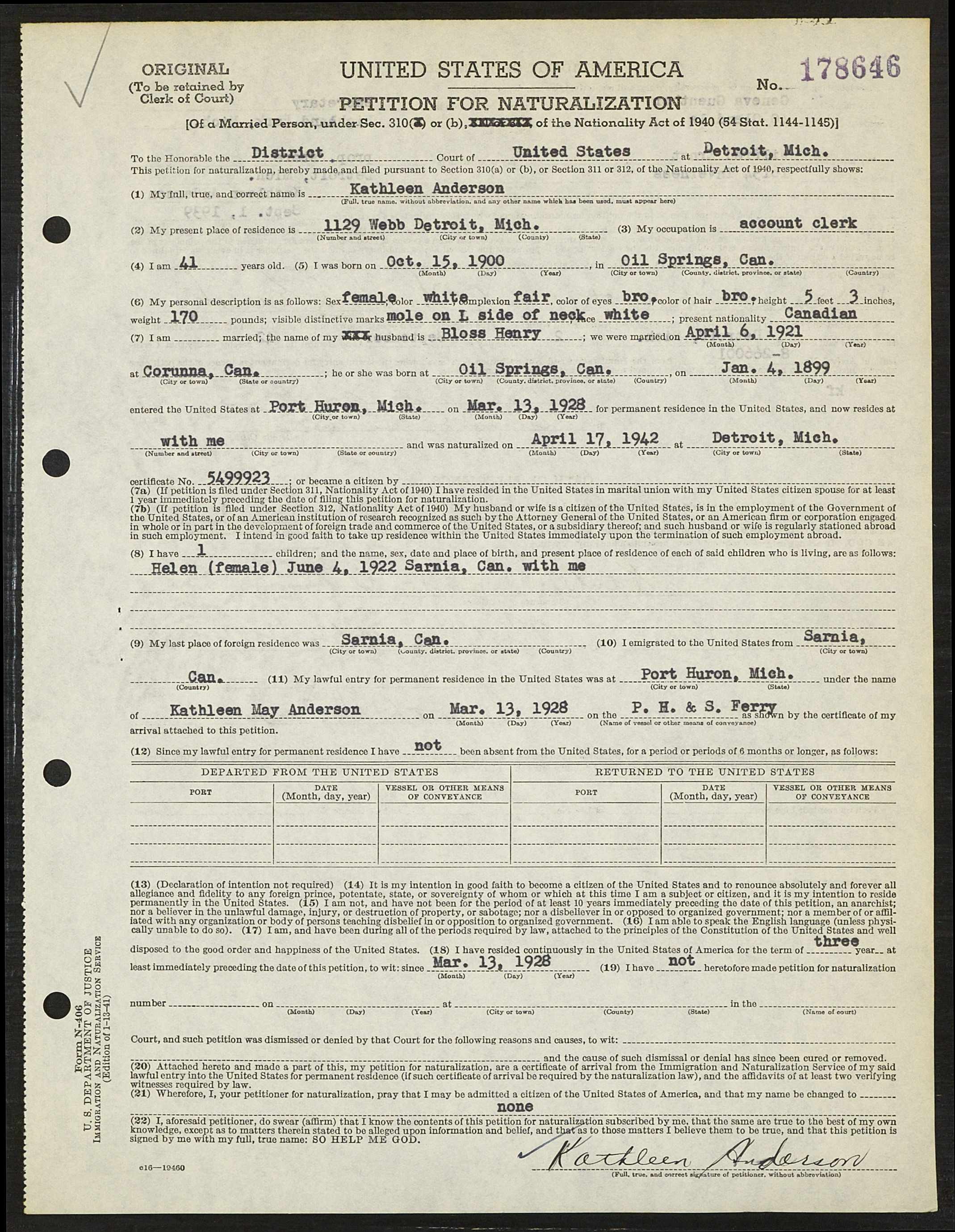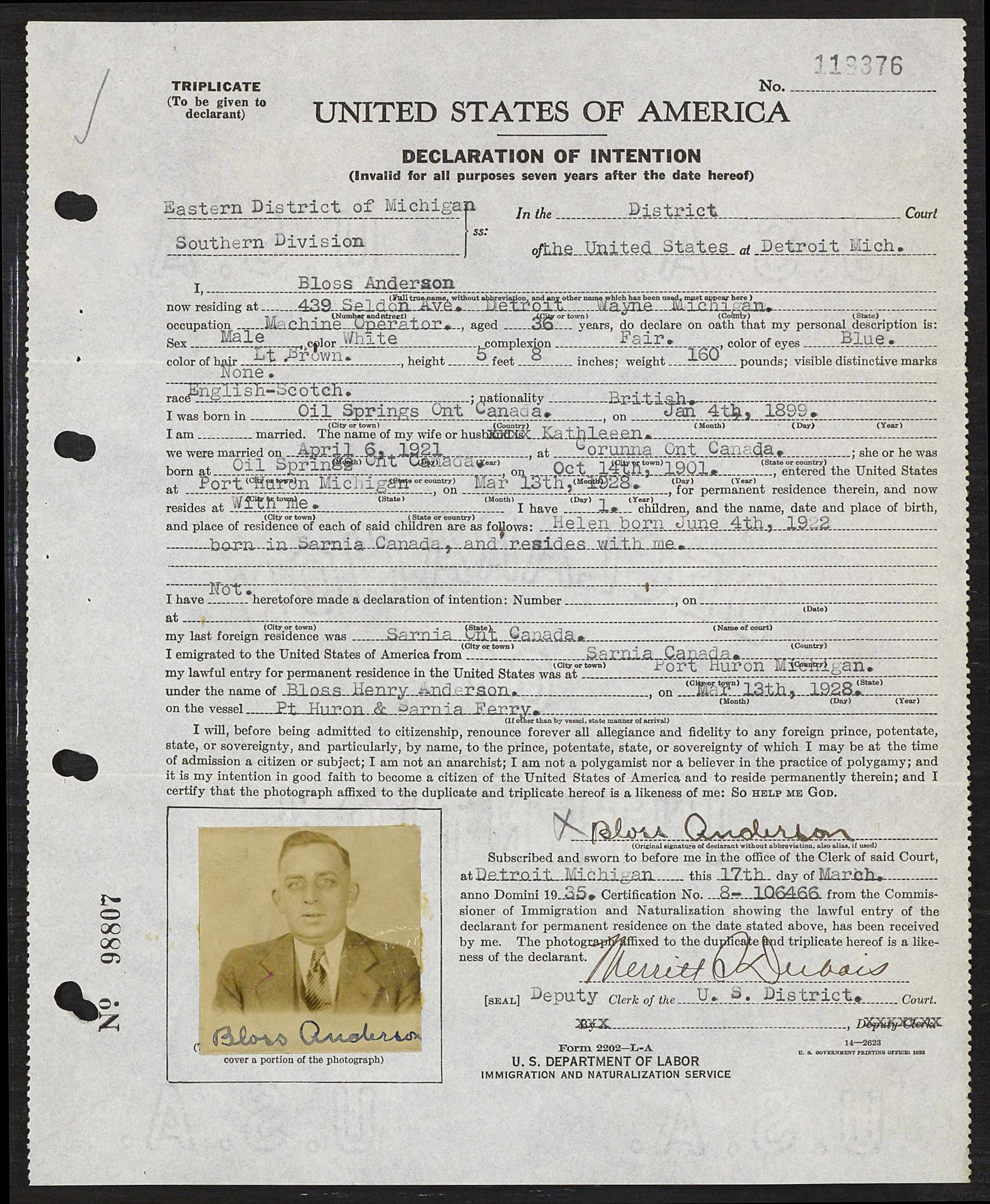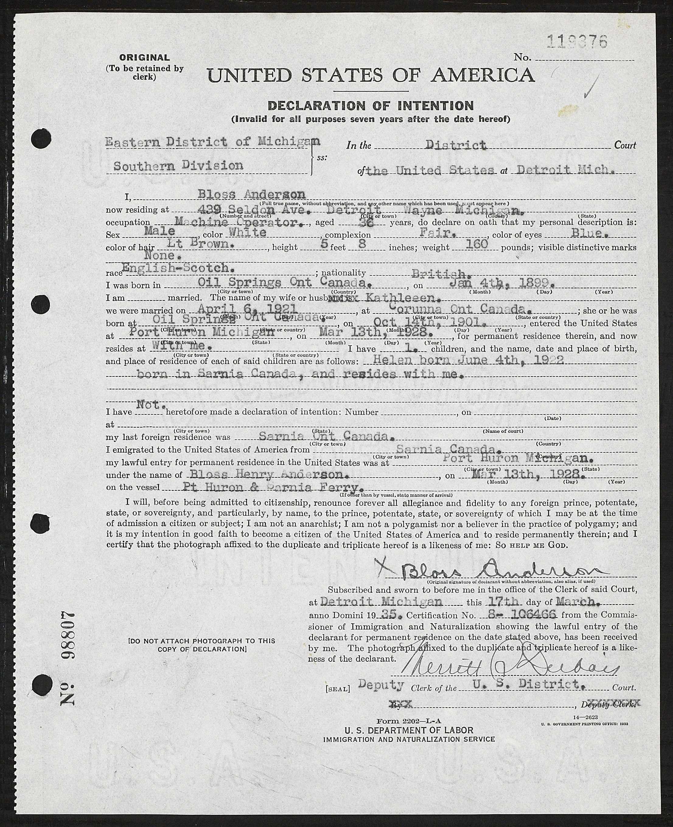 Family Search: When Private Bloss Henry Anderson was born on 4 January 1899, in Oil Springs, Lambton, Ontario, Canada, his father, Francis Smith Anderson, was 41 and his mother, Annie Maria Berry, was 36. He married Kathleen May Simpson on 24 March 1921, in Sarnia, Lambton, Ontario, Canada. They were the parents of at least 1 son and 2 daughters. He immigrated to Port Huron, St. Clair, Michigan, United States in 1941 and lived in Detroit Ward 6, Detroit, Wayne, Michigan, United States in 1940 and Detroit, Wayne, Michigan, United States in 1950. He registered for military service in 1916. In 19, his occupation is listed as driver in Sarnia, Lambton, Ontario, Canada. He died on 18 August 1966, in Hutchinson, Reno, Kansas, United States, at the age of 67, and was buried in Memorial Park Cemetery, Hutchinson, Reno, Kansas, United States.
