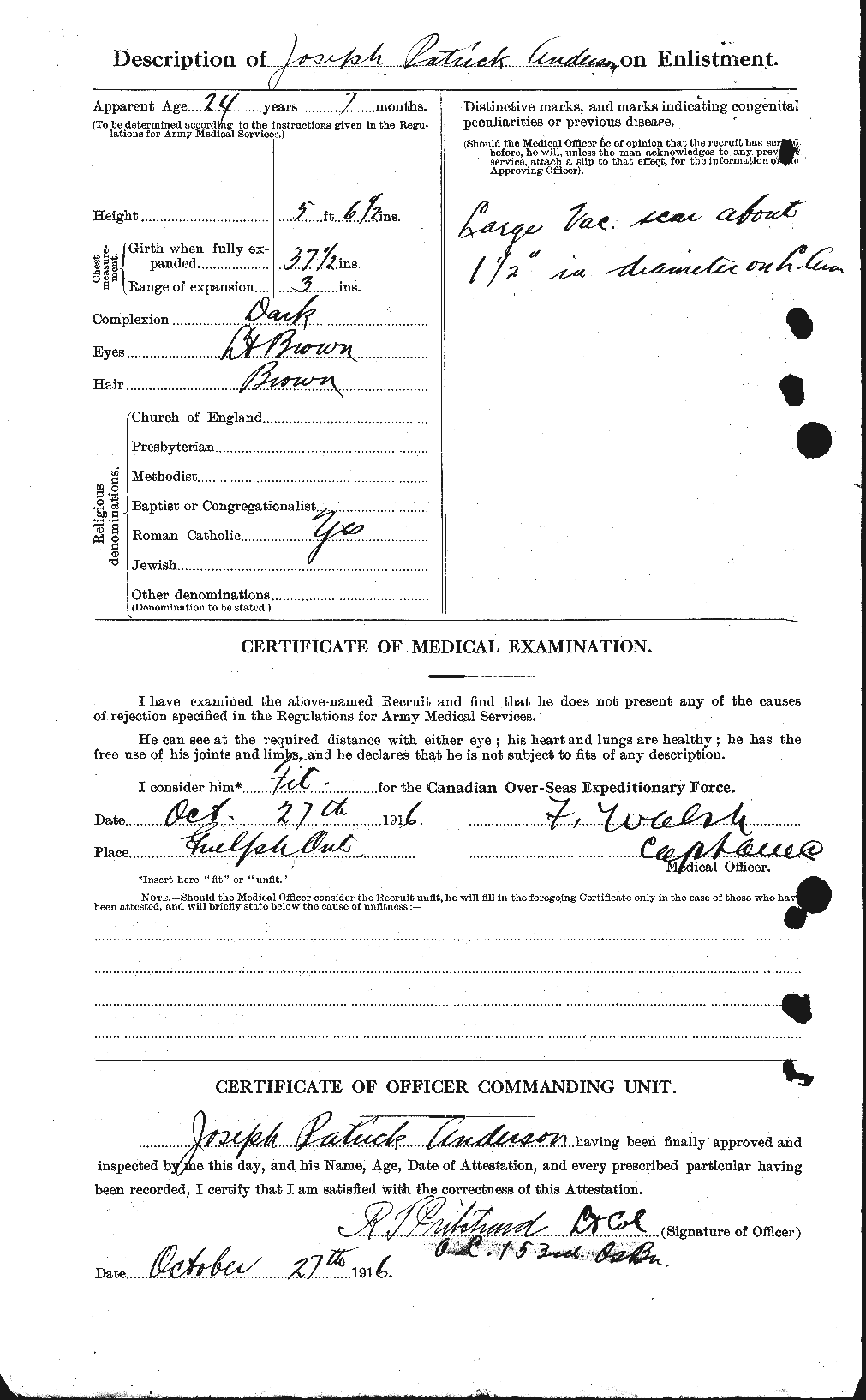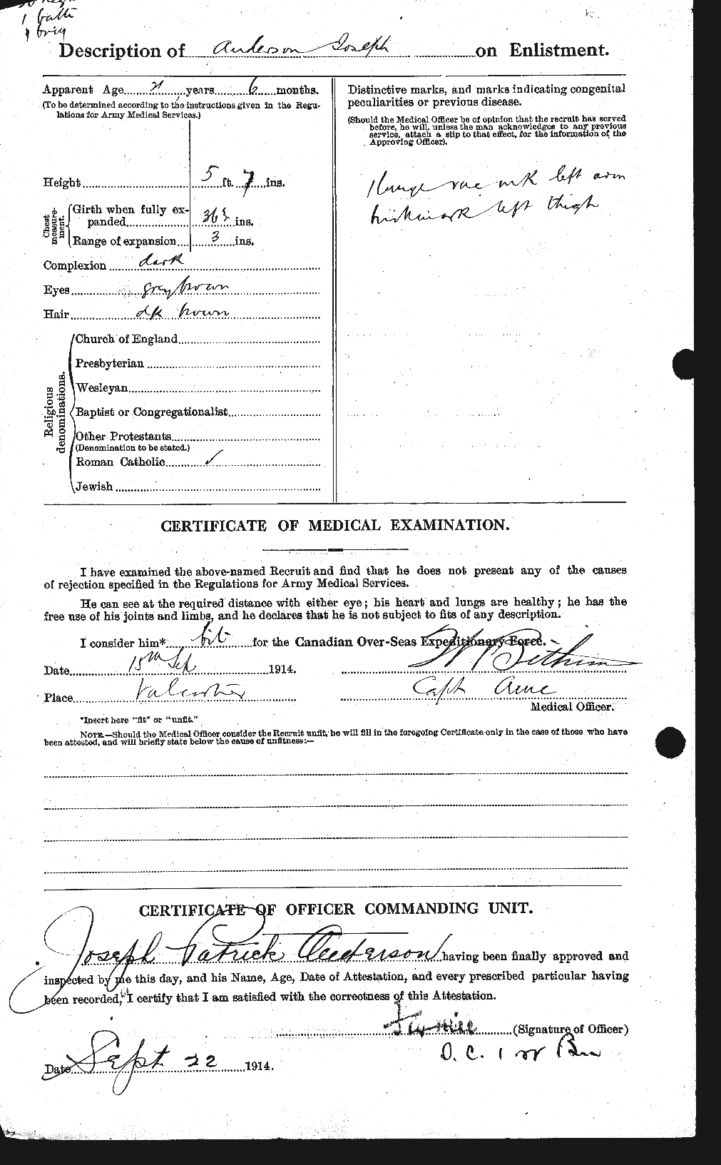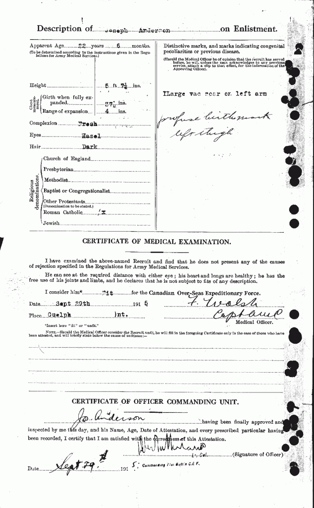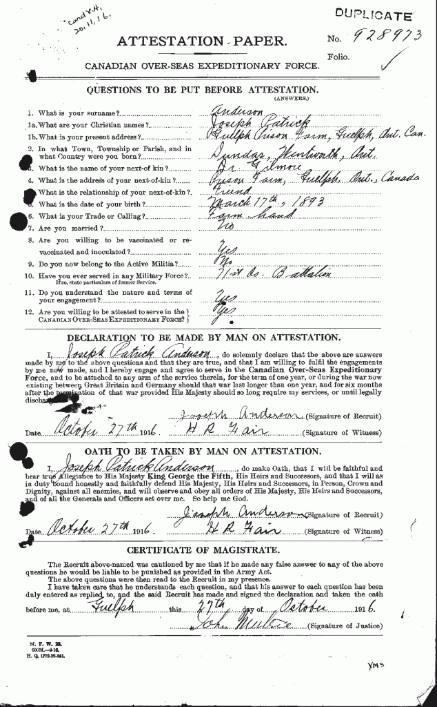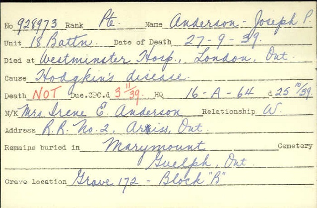 Family Search: Private Joseph Patrick Anderson was born on 17 March 1893, in Dundas, Hamilton, Ontario, Canada as the son of John Anderson and Catherine McGregor. He married Irene Meyer on 28 October 1919, in Guelph, Wellington, Ontario, Canada. They were the parents of at least 1 daughter. He registered for military service in 1916. In 1916, at the age of 23, his occupation is listed as farm hand. guelph prison farm in Guelph, Wellington, Ontario, Canada. He died on 27 September 1939, in London Township, Middlesex, Ontario, Canada, at the age of 46, and was buried in Marymount Roman Catholic Cemetery, Guelph, Wellington, Ontario, Canada.