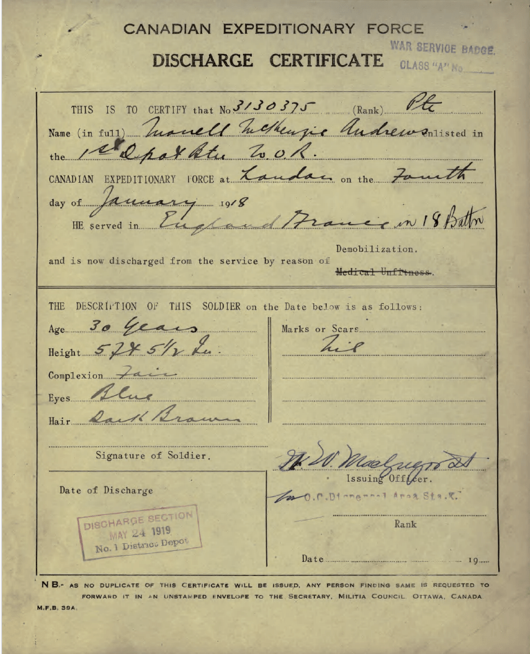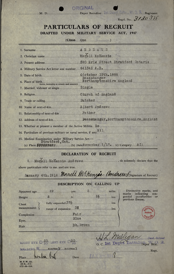 Family Search: When Morrell Mackenzie Lovsy Andrews was born on 19 October 1889, in Deanshanger, Northamptonshire, England, United Kingdom, his father, Albert Andrews, was 33 and his mother, Emma Rebecca Rawlings, was 31. He married Jeannie Imrie Birell on 19 May 1920, in Perth, Ontario, Canada. They were the parents of at least 1 son. He immigrated to Eastern, Floyd, Kentucky, United States in 1912 and lived in Passenham, Northamptonshire, England, United Kingdom for about 10 years. He registered for military service in 1918. In 1931, at the age of 42, his occupation is listed as machinist, cnr shop in Stratford, Perth, Ontario, Canada. He died on 14 May 1946, in Stratford, Perth, Ontario, Canada, at the age of 56, and was buried in Avondale Cemetery, Stratford, Perth, Ontario, Canada.