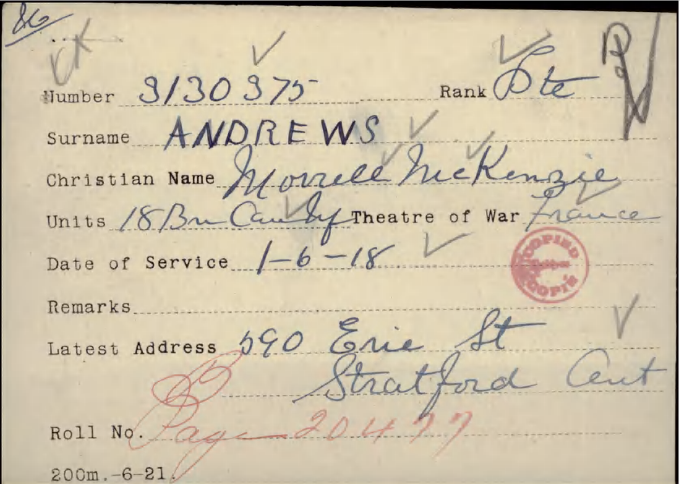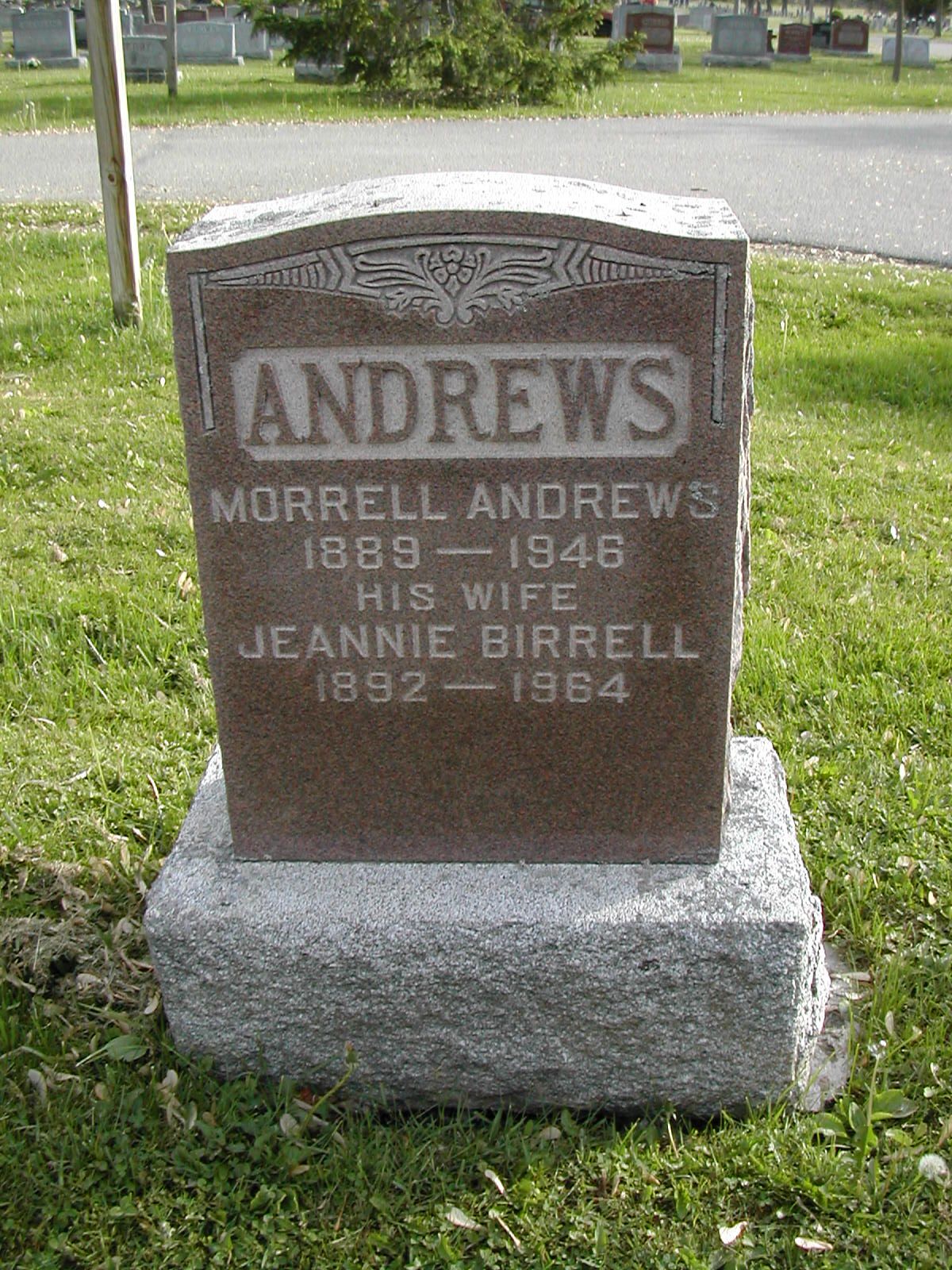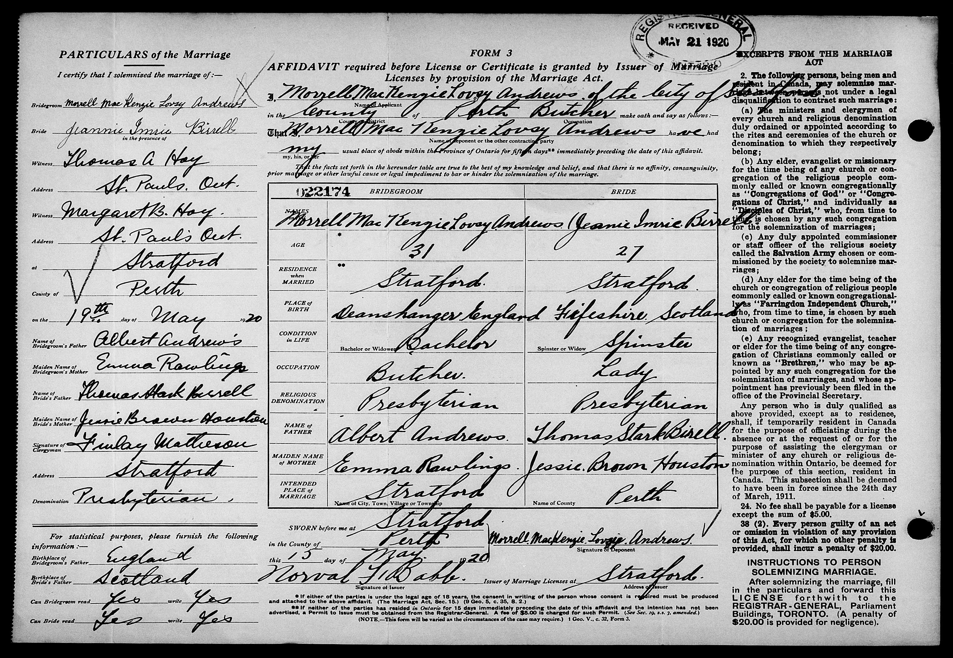 Family Search: When Morrell Mackenzie Lovsy Andrews was born on 19 October 1889, in Deanshanger, Northamptonshire, England, United Kingdom, his father, Albert Andrews, was 33 and his mother, Emma Rebecca Rawlings, was 31. He married Jeannie Imrie Birell on 19 May 1920, in Perth, Ontario, Canada. They were the parents of at least 1 son. He immigrated to Eastern, Floyd, Kentucky, United States in 1912 and lived in Passenham, Northamptonshire, England, United Kingdom for about 10 years. He registered for military service in 1918. In 1931, at the age of 42, his occupation is listed as machinist, cnr shop in Stratford, Perth, Ontario, Canada. He died on 14 May 1946, in Stratford, Perth, Ontario, Canada, at the age of 56, and was buried in Avondale Cemetery, Stratford, Perth, Ontario, Canada.