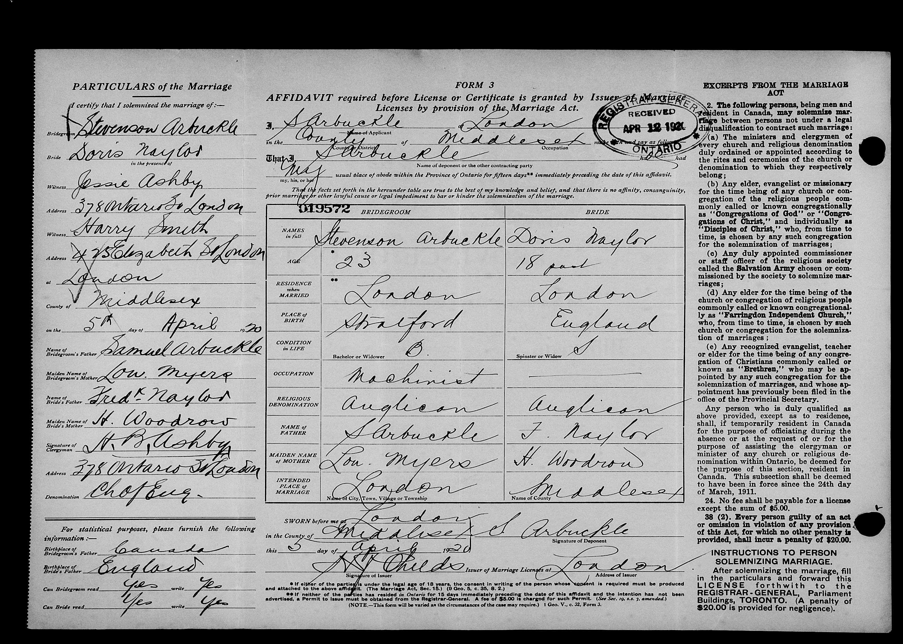 Family Search: When Private Stevenson Arbuckle was born on 20 March 1897, in Stratford, Perth, Ontario, Canada, his father, Samuel Frederick Arbuckle, was 24 and his mother, Louise Myers, was 23. He married Doris Naylor on 5 April 1920, in London, Ontario, Canada. They were the parents of at least 2 sons and 1 daughter. He lived in Middlesex, Ontario, Canada in 1901. He registered for military service in 1918. In 1918, at the age of 21, his occupation is listed as machinist in London, Ontario, Canada. He died on 8 April 1948, in London, Ontario, Canada, at the age of 51, and was buried in Woodland Cemetery, London, Ontario, Canada.
