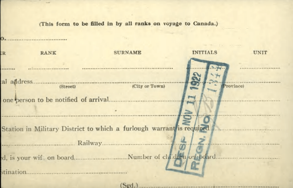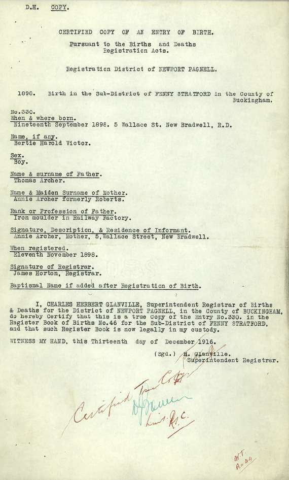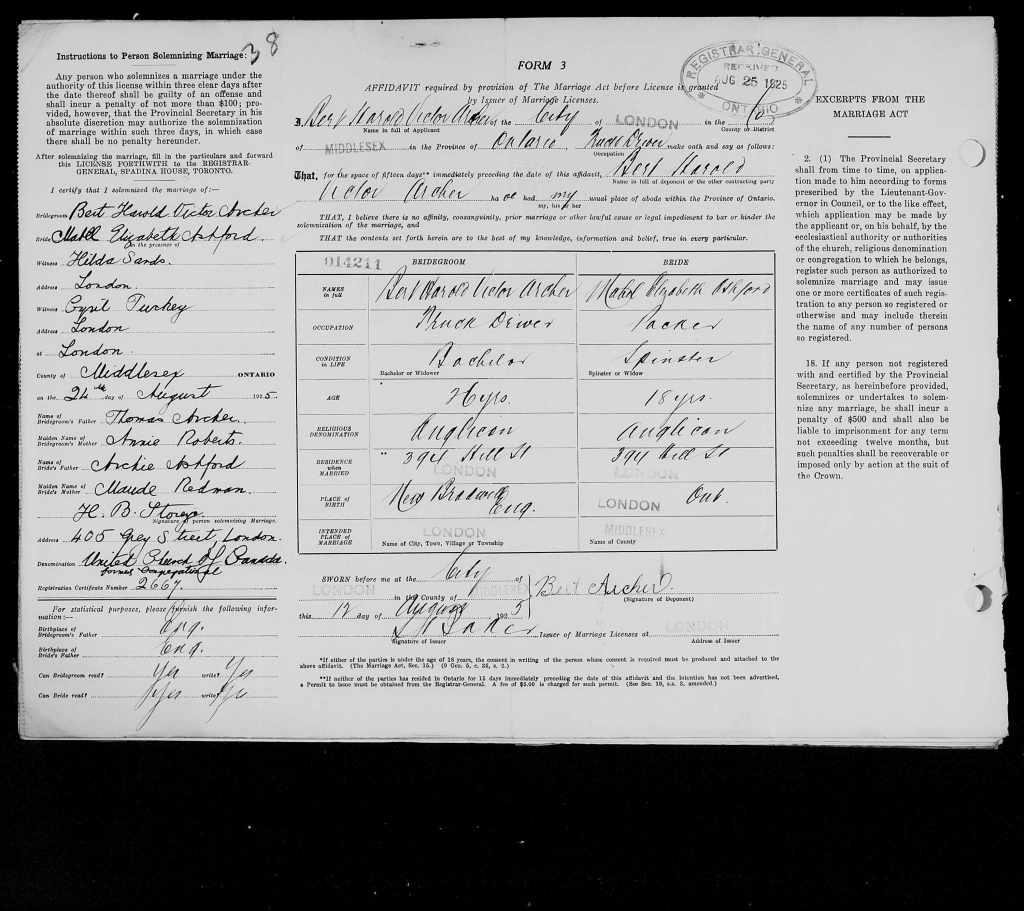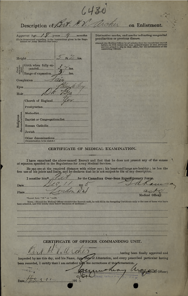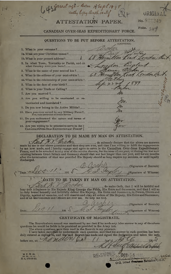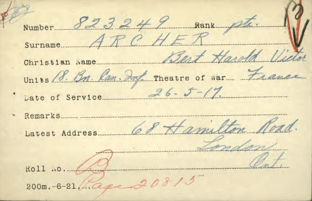 Family Search: When Private Bert Harold Victor Archer was born on 19 September 1889, in New Bradwell, Buckinghamshire, England, United Kingdom, his father, Thomas Archer, was 21 and his mother, Annie Roberts, was 27. He married Mabel Elizabeth Ashford on 24 August 1925, in London Township, Middlesex, Ontario, Canada. He immigrated to Canada in 190 and lived in London, Canada West, British Colonial America in 1911 and London, Ontario, Canada in 1915. He registered for military service in 1915. In 1915, at the age of 26, his occupation is listed as baker in London, Ontario, Canada. He died in 1965, at the age of 76, and was buried in Woodland Cemetery, London, Ontario, Canada.