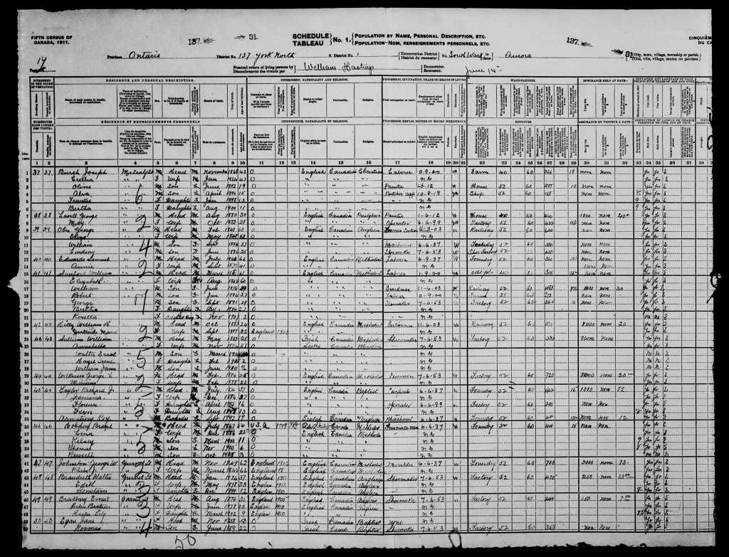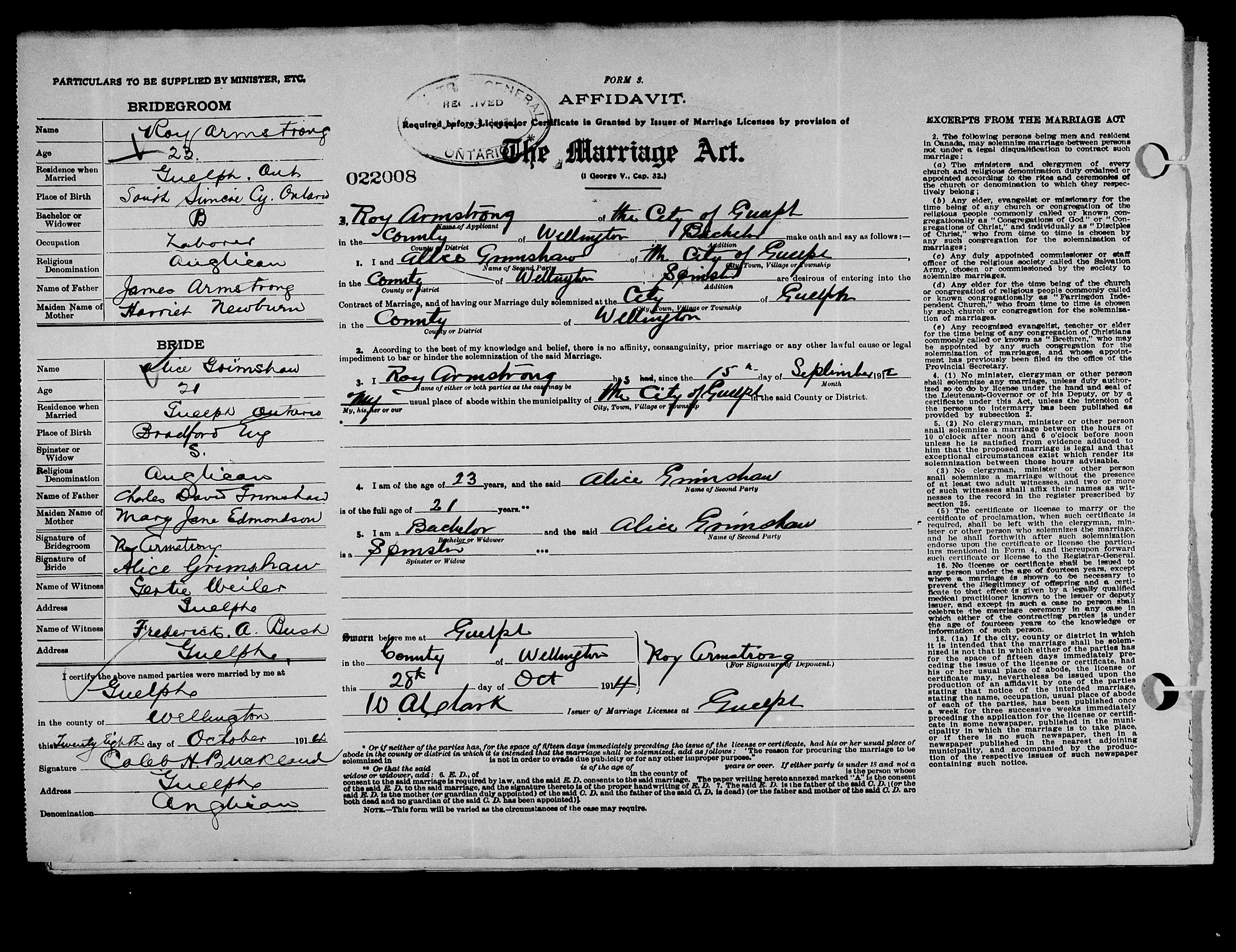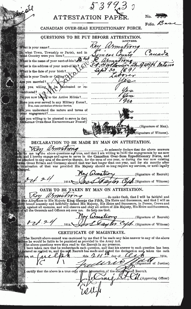“Trade listed as Laborer. DOB 30-9-91, born Simcoe County. NOK Alice Armstrong, wife. Enlisted 18th Battalion Guelph 24-10-14 (age 23 years 1 month), lists service in Militia (30th). 5 foot 6 inches. Brown eyes, dark brown hair. Church of England. Embarked with 18th Battalion 18-4-15, Halifax, SS Grampion. Various hospitalizations upon arrival England. Discovered suffering from TB, returned to Canada aboard SS Scandanavian 16-5-16. Medical Board Quebec P.Q. 20-5-16 recommends discharge, adhesions from appendicitis operation. Discharged Toronto 27-11-16, medically unfit. Medical Board London 8-11-17, TB, recommends solder be re-attested for 3 months treatment. Spent two months in Byron Sanitorium, London. 4-3-18, discharged Medically Unfit. DVA notice reports death 1-10-64, no further information.