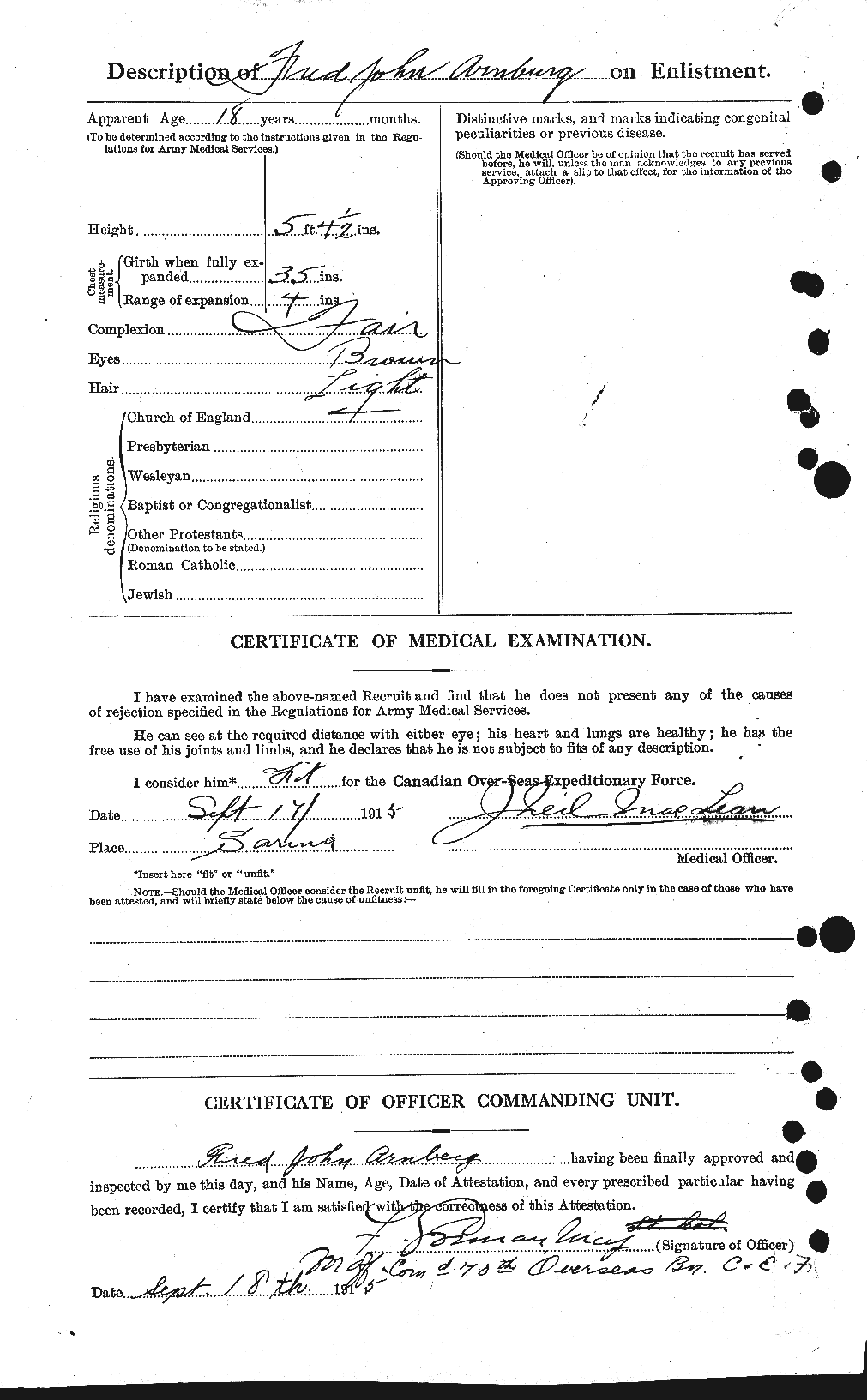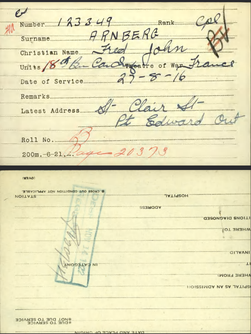 Family Search: When Private Frederick John Arnberg was born on 26 July 1897, in Eagle Lake, Haliburton, Ontario, Canada, his father, Charles Arnberg, was 25 and his mother, Mary Eleanor Macdonald, was 23. He lived in Point Edward, Lambton, Ontario, Canada in 1922 and Sarnia, Lambton, Ontario, Canada in 1973. He registered for military service in 1915. In 1915, at the age of 18, his occupation is listed as sailor. He died on 2 August 1973, at the age of 76, and was buried in Lakeview Cemetery, Sarnia, Lambton, Ontario, Canada.