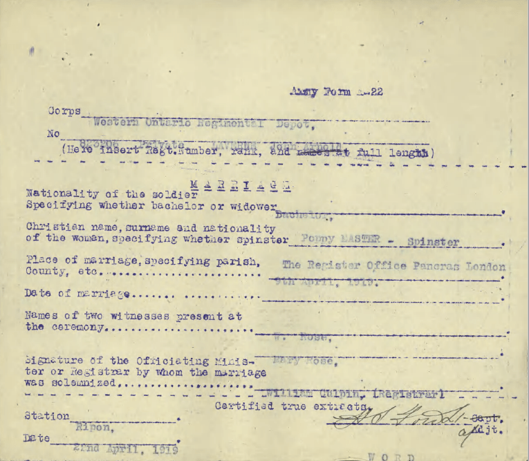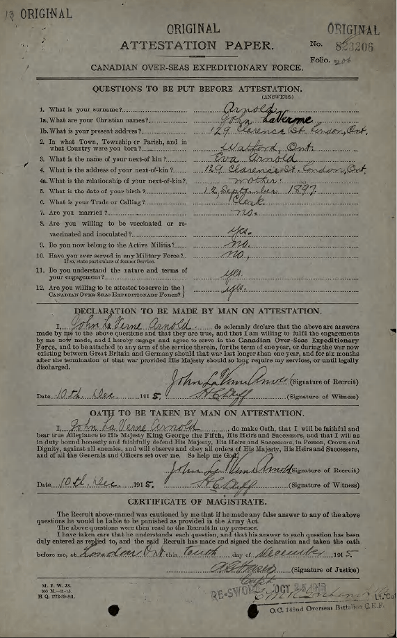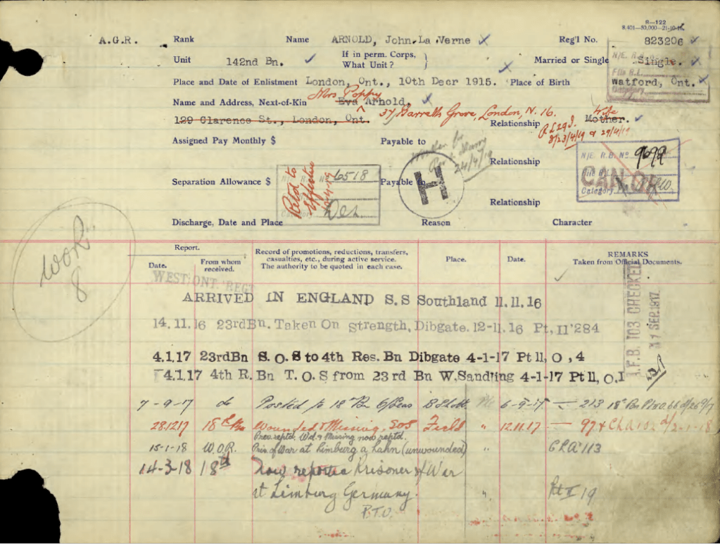 Family Search: When John Laverne Arnold was born on 12 December 1897, in Ontario, Canada, his father, William Arnold, was 33 and his mother, Margaret Eva McWaters, was 30. He married Poppy Ethel Easter Arnold on 22 April 1919, in Ripon, Yorkshire, England, United Kingdom. He lived in London, Ontario, Canada West, British Colonial America in 1911 and London, Ontario, Canada in 1915. He registered for military service in 1915. In 1915, at the age of 18, his occupation is listed as clerk in London, Ontario, Canada. He died in 1968, in Ontario, Canada, at the age of 71, and was buried in Mount Pleasant Cemetery, West McGillivray, North Middlesex, Middlesex, Ontario, Canada.