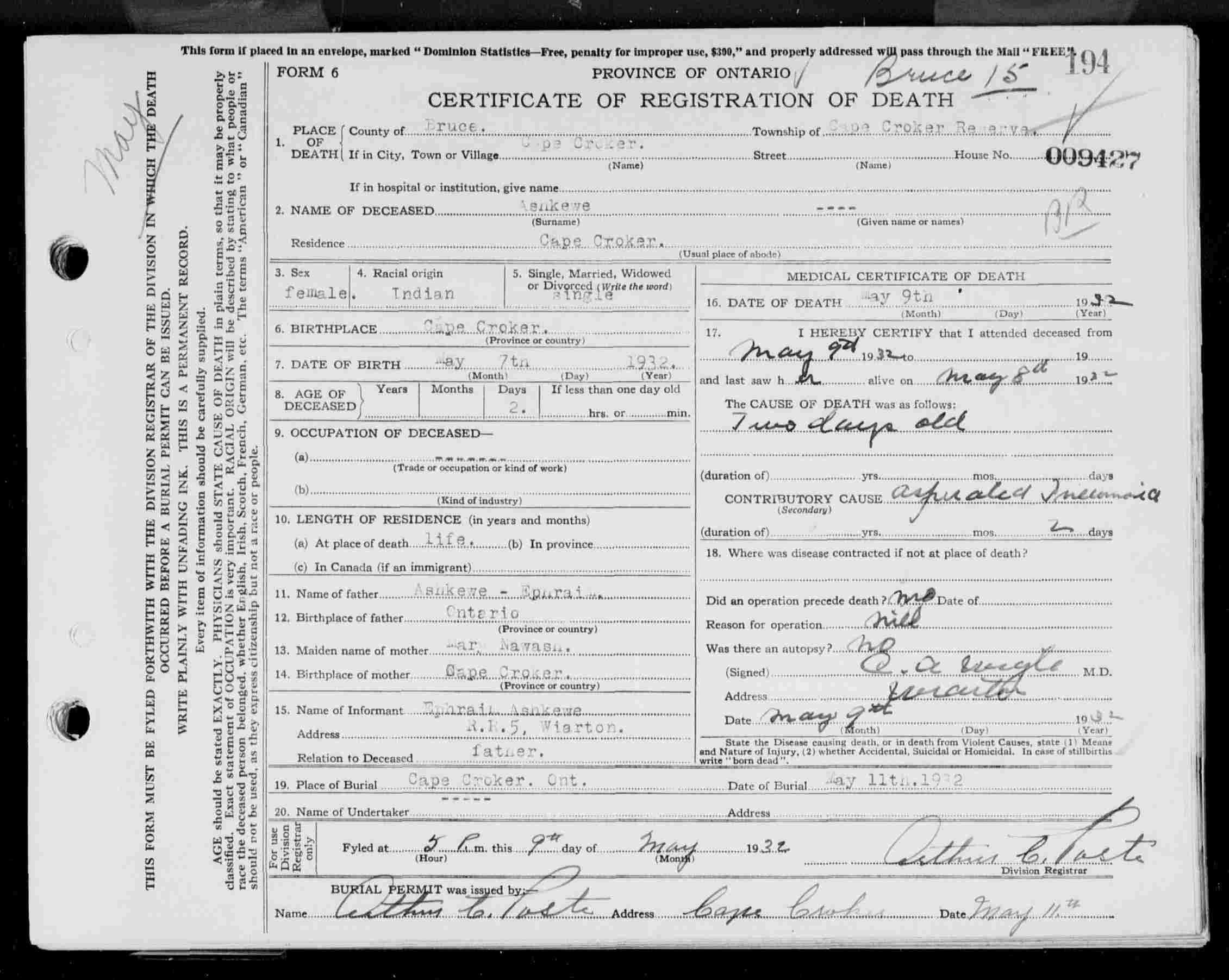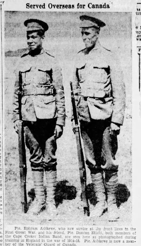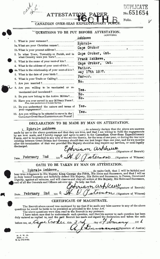Family Search: When Ephriam W. Ashkewe was born on 17 May 1897, in Cape Croker, Neyaashiinigmiing, Bruce, Ontario, Canada, his father, Frank Ashkewe, was 33 and his mother, Julia Ann Elliott, was 27. He had at least 1 son and 2 daughters with Mary Nawash. He registered for military service in 1916. In 1916, at the age of 19, his occupation is listed as farmer.
