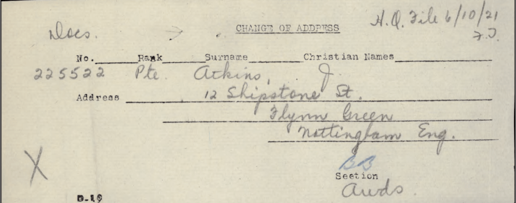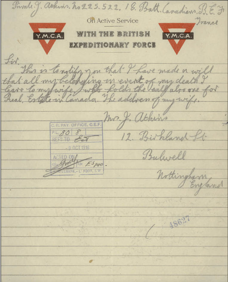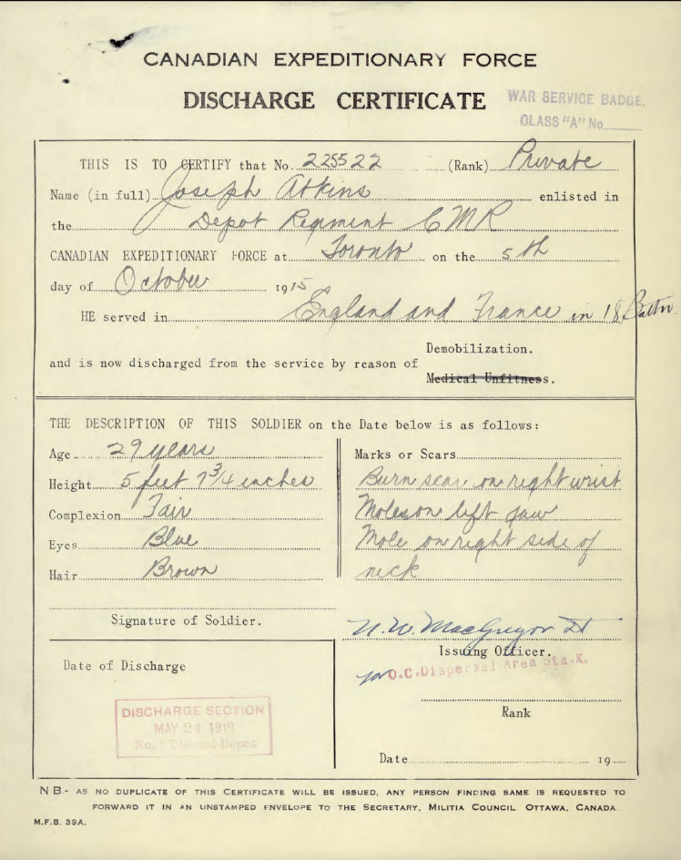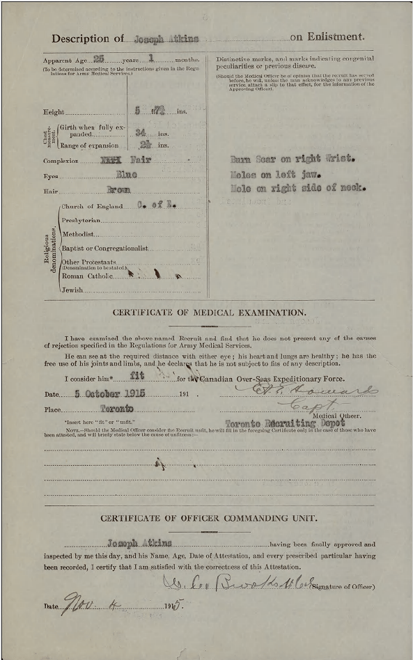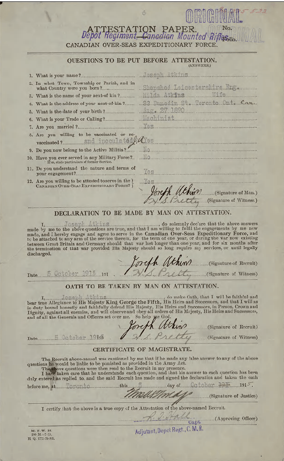 Family Search: When Private Joseph Atkins was born on 27 August 1890, in Shepshed, Leicestershire, England, United Kingdom, his father, Charles T Atkins, was 28 and his mother, Charlotte Draper, was 35. He married Hilda Rowell on 25 May 1912, in Toronto, York, Ontario, Canada. He immigrated to Canada in 1913 and lived in Toronto, York, Ontario, Canada in 1915 and Nottingham, Nottinghamshire, England, United Kingdom in 1921. He registered for military service in 1915. In 1915, at the age of 25, his occupation is listed as machinist in Toronto, York, Ontario, Canada. He died in 1973, in Leicestershire, England, United Kingdom, at the age of 83.