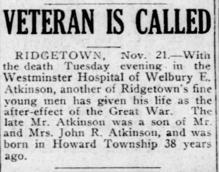 Family Search: When Private Welbury Edmund Atkinson was born on 20 October 1886, in London, Ontario, Canada, his father, John R. Atkinson, was 25 and his mother, Mary Ann Mitton, was 23. He married Ivy Henrietta Violet Webb on 30 April 1919, in Chatham, Chatham-Kent, Ontario, Canada. He lived in Elgin, Rideau Lakes, Leeds and Grenville, Ontario, Canada in 1901 and Batavia, Kane, Illinois, United States in 1910. He died on 17 November 1924, in Ridgetown, Kent, Ontario, Canada, at the age of 38, and was buried in Greenwood Cemetery, Ridgetown, Chatham-Kent, Ontario, Canada.