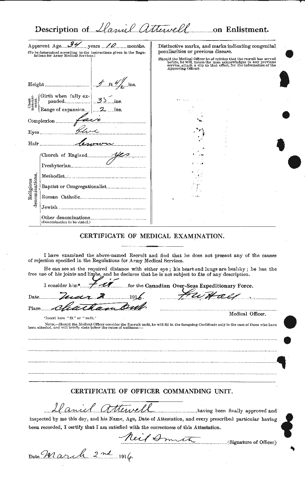 Pte Daniel Attewell, Service # 880115 lived at 85 Edgar Street, Chatham, Ontario with his wife listed as next of kin at same address. Born in Hampshire England on May 2nd 1881 (actually 1880 is true year). Immigrated in May 1914 with wife Mary Elizabeth, and 4 children; Frederick George, Kathleen Lydia, William Daniel, and Thomas. His occupation was listed as a coachman (rail station). Enlisted in Chatham on May 2nd 1916 on his 35th birthday. 186th and 18th Battalions. Daniel died May 3, 1938, one day after his birthday, with one cause mentioned – pleurisy, due to military service. He survived to come home, but the Great War eventually took him. RIP Pte Attewell, you are remembered.