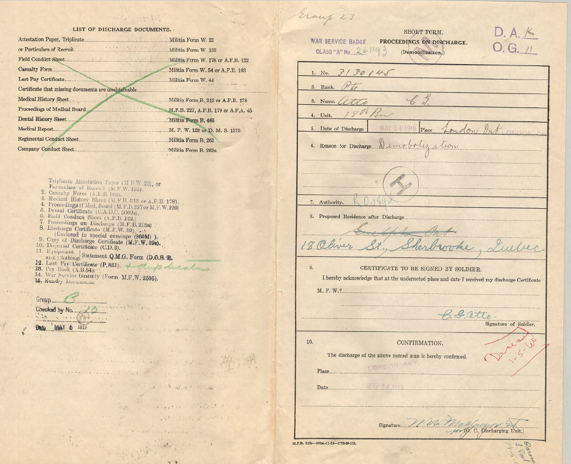 Family Search: When Private Clifford George Atto was born on 15 October 1886, in Sherbrooke, Quebec, Canada, his father, Joseph Thompson Atto, was 36 and his mother, Elizabeth Sperry, was 35. He had at least 3 daughters with Sadie Atto. He registered for military service in 1918. In 1918, at the age of 32, his occupation is listed as carpet weaver in Guelph, Wellington, Ontario, Canada. He died on 1 May 1960, in Guelph, Wellington, Ontario, Canada, at the age of 73, and was buried in Woodlawn Memorial Park, Guelph, Wellington, Ontario, Canada.
