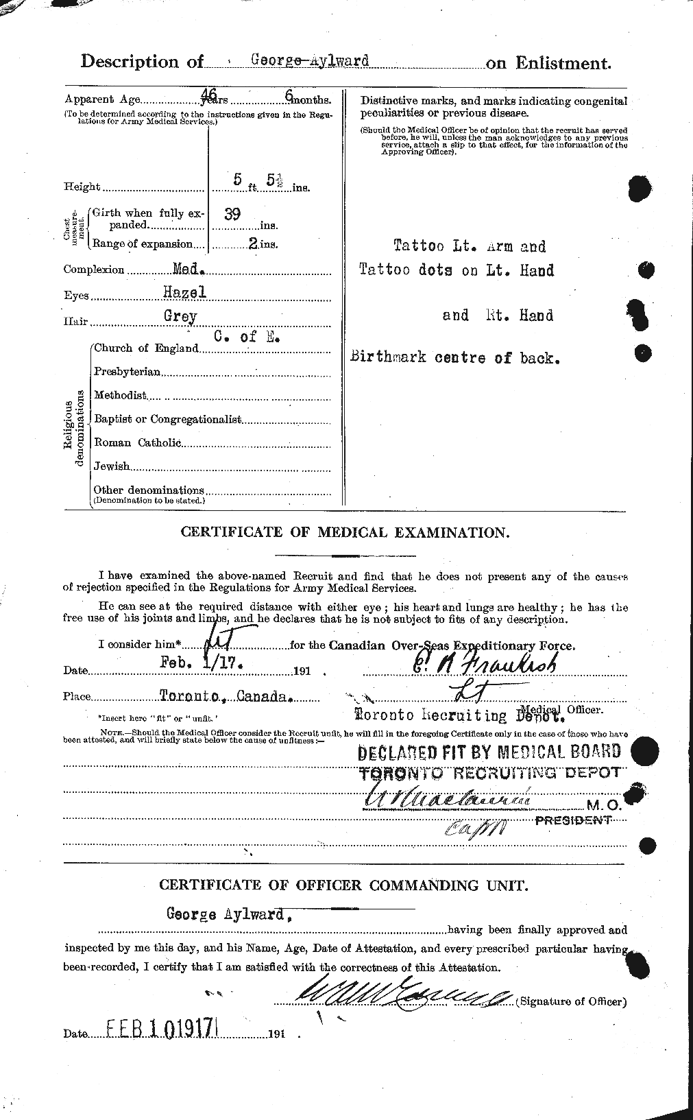 Originally attested to the 18th Battalion and subsequently re-attested in Toronto, Ontario on February 1, 1917 under the service no. 1099296 with the 256th Battalion.