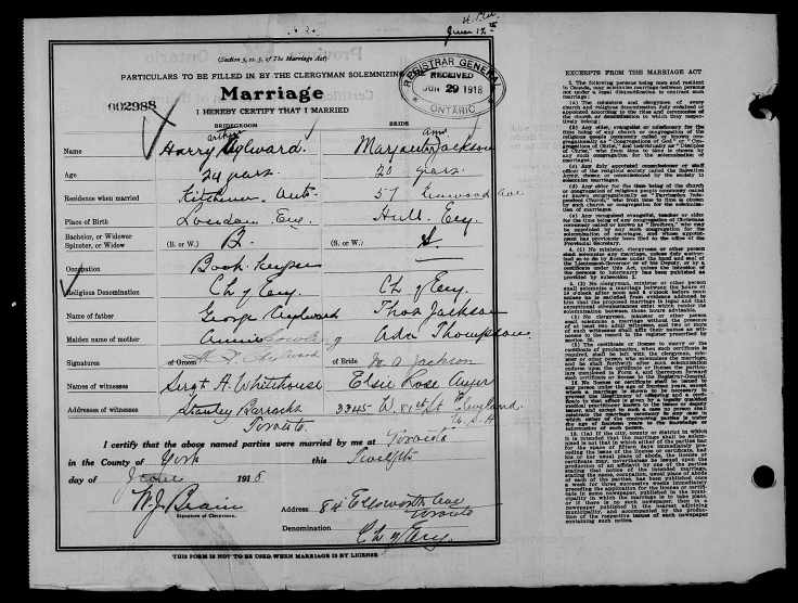 He enlisted in Kitchener in November 1914, aged 46. He went overseas on April 18, 1915. He was relieved from duties, however, due to illness and discharged. He re-enlisted in February 1, 1917 at the Toronto Recruiting Depot and was in the 18th Battalion for 17 months as a private. He went to the front in June 1917. George survived and returned home on August 31, 1917. Four Aylwards, all related, served and are listed here: George, Harry Arthur (George’s son), Henry (George’s nephew), and Henry Albert (George’s brother).