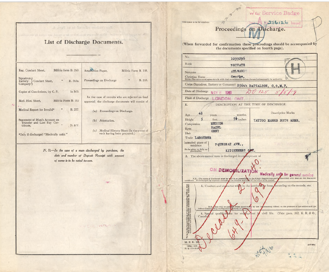 “George was born in Bromley, Kent, England in July 28, 1870, the son of Abraham and Sarah Aylward of Faversham, England. George immigrated and married Annie. At enlistment they lived at 37 Pequegnat Avenue in Kitchener and George stated he was a labourer. Prior to World War 1 service, George participated in the Zulu War and the South African War for which he received two medals with bars.