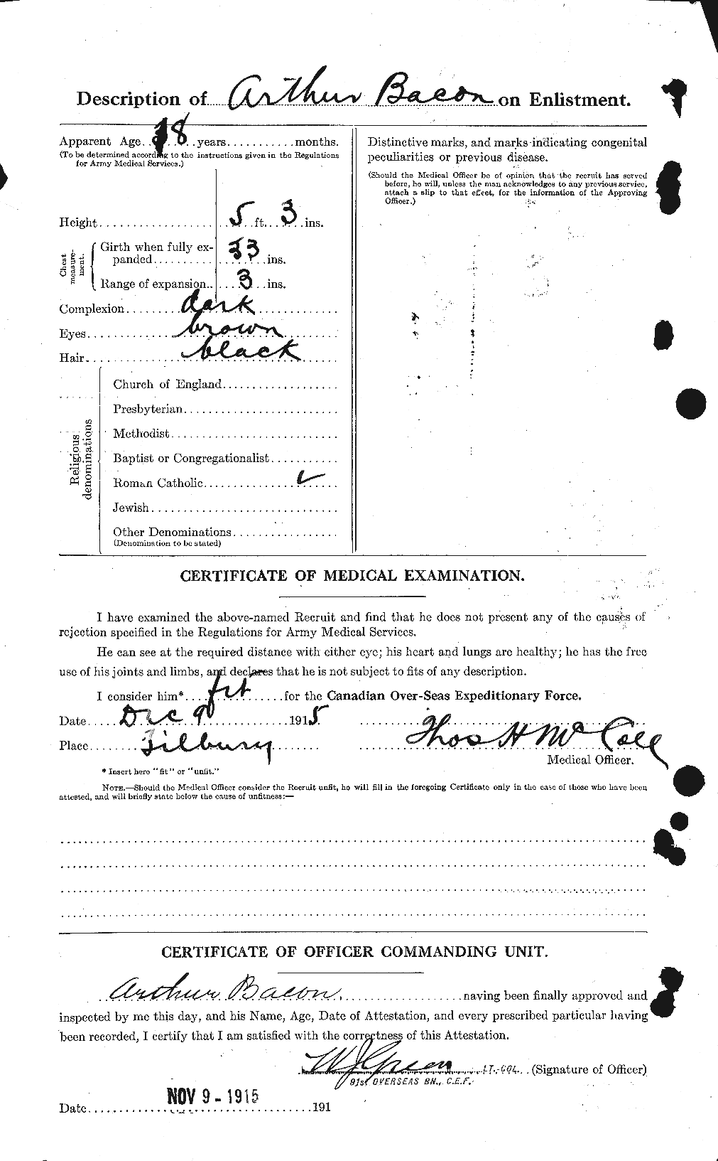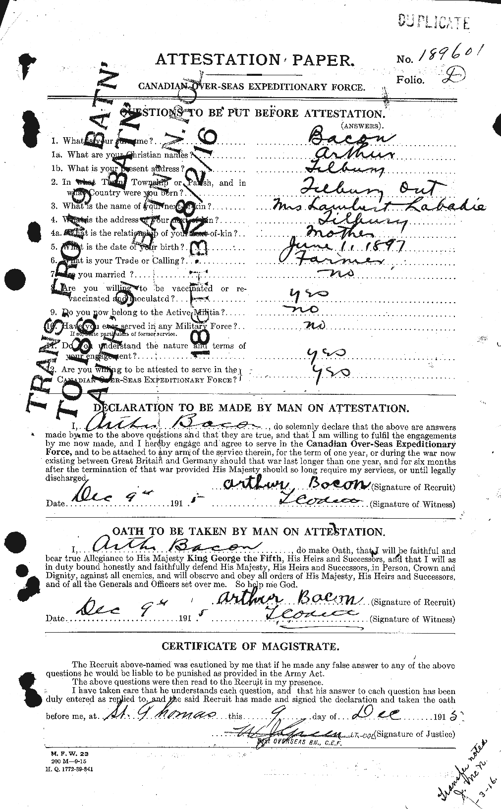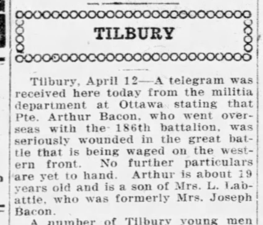 Family Search: When Private Arthur Joseph Bacon was born on 1 June 1898, in Tilbury, Kent, Ontario, Canada, his father, Joseph Bacon Jr, was 26 and his mother, Margaret McGuinness, was 22. He married Marie Rose Zoe Fidelia Lajoie on 12 November 1932, in Saint-Pierre, Saint Pierre and Miquelon. They were the parents of at least 1 son. He lived in St. Joachim, Essex, Ontario, Canada in 1922. He registered for military service in 1915. In 1915, at the age of 17, his occupation is listed as farmer in Tilbury, Kent, Ontario, Canada. He died on 5 January 1976, in Essex, Ontario, Canada, at the age of 77, and was buried in Tilbury, Kent, Ontario, Canada.