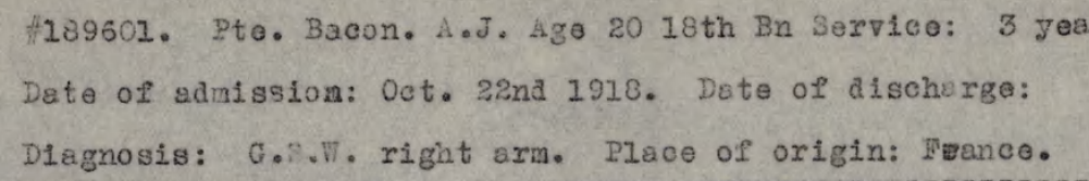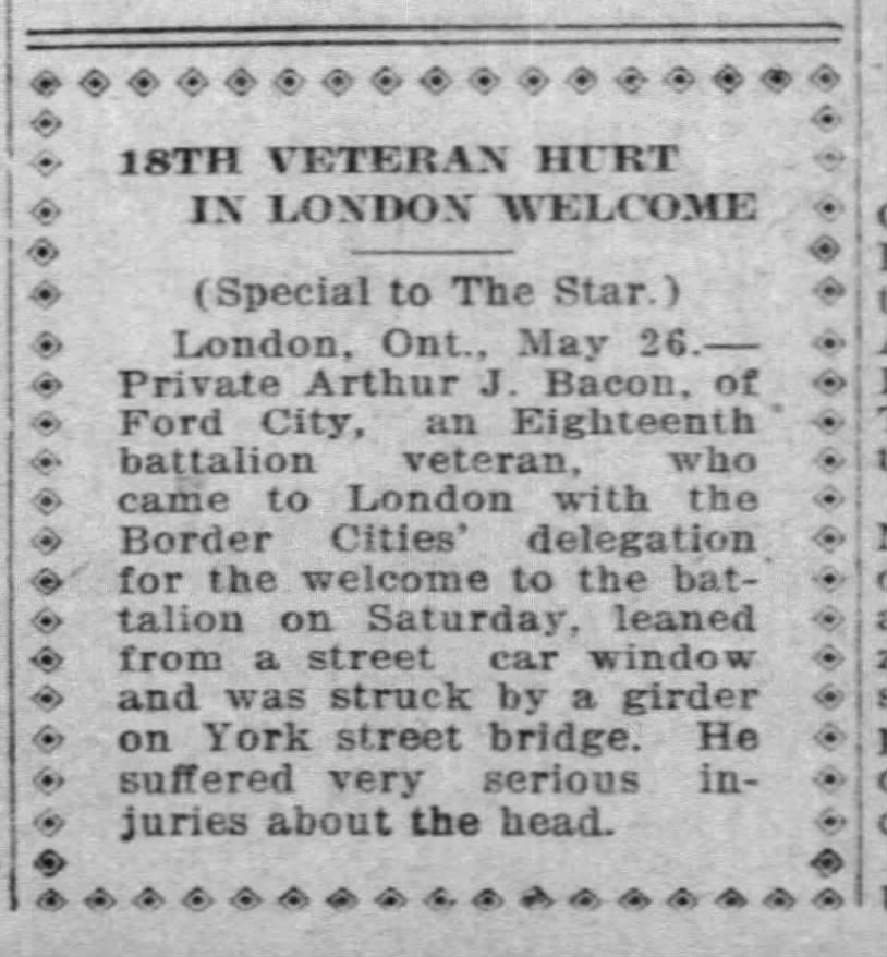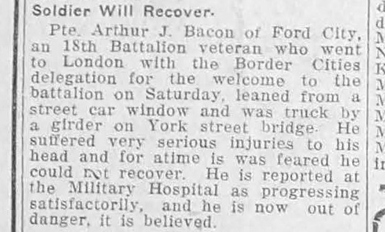 Pte. Arthur J. Bacon of Ford City, an 18th Battalion veteran who went to London with the Border Cities delegation for the welcome to the battalion on Saturday, leaned from a street car window and was struck by a girder on York street bridge. He suffered very serious injuries to his head and for a time it was feared he could not recover. He is reported at the Military Hospital as progressing satisfactorily, and he is now out of danger, it is believed.