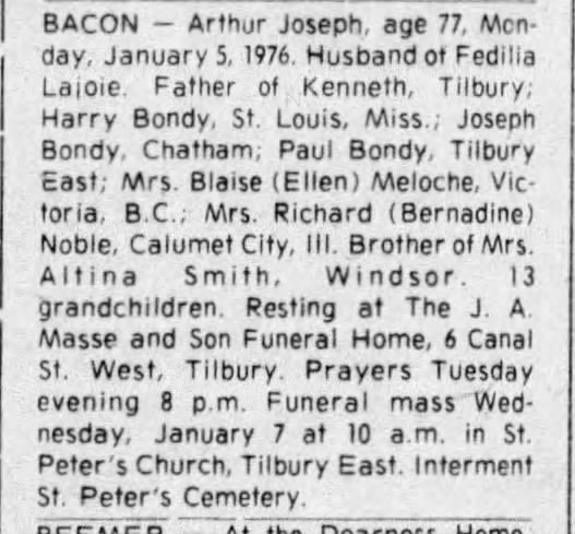 BACON – Arthur Joseph, age 77, Mon- day, January 5, 1976. Husband of Fedilia Lajoie. Father of Kenneth, Tilbury; Harry Bondy, St. Louis, Miss.; Joseph Bondy, Chatham; Paul Bondy, Tilbury East; Mrs. Blaise (Ellen) Meloche, Vic- toria, B.C.; Mrs. Richard (Bernadine) Noble, Calumet City, Ill. Brother of Mrs. Altina Smith, Windsor. 13 grandchildren. Resting at The J. A. Masse and Son Funeral Home, 6 Canal St. West, Tilbury. Prayers Tuesday evening 8 p.m. Funeral mass Wed- nesday, January 7 at 10 a.m. in St. Peter’s Church, Tilbury East. Interment St. Peter’s Cemetery.