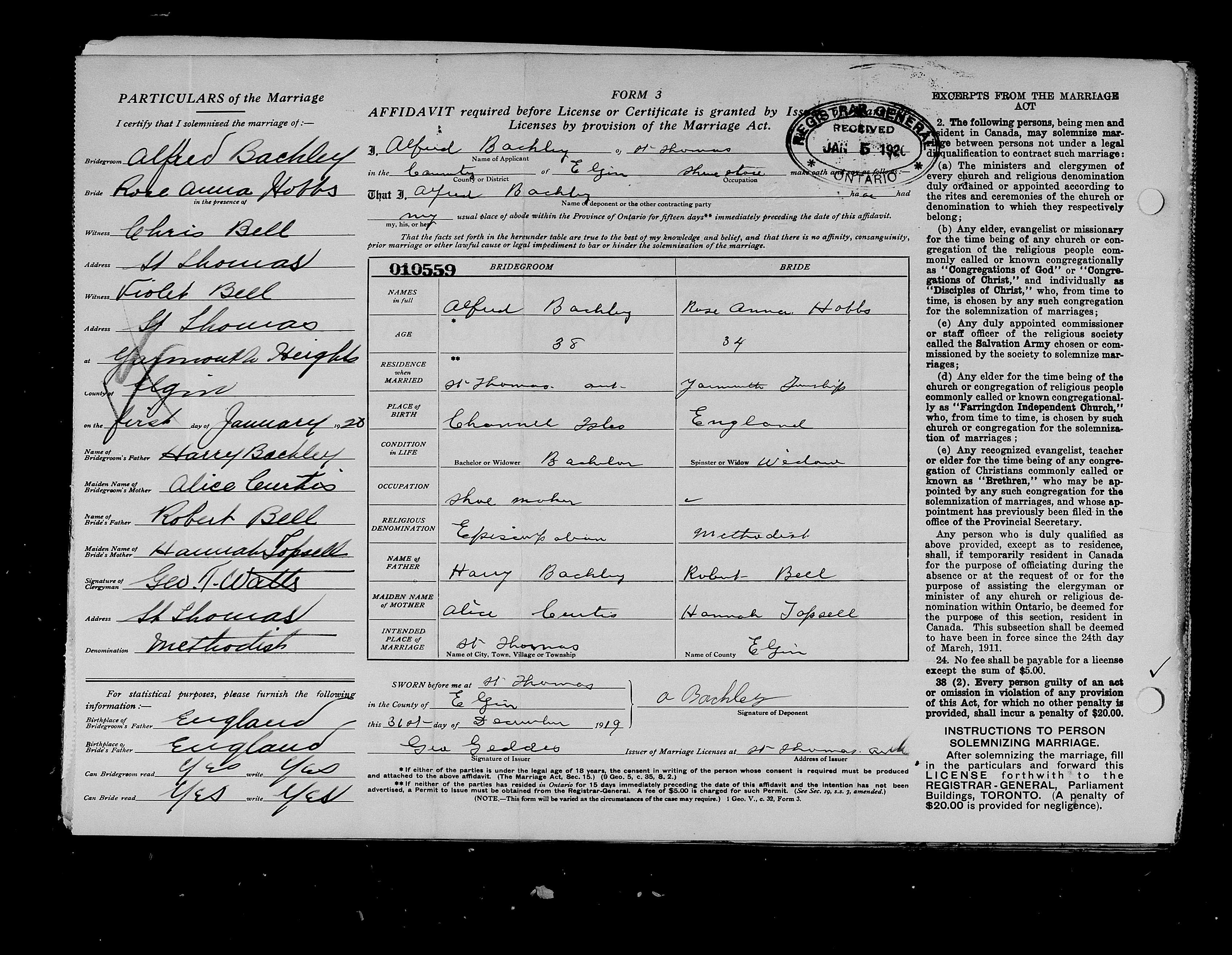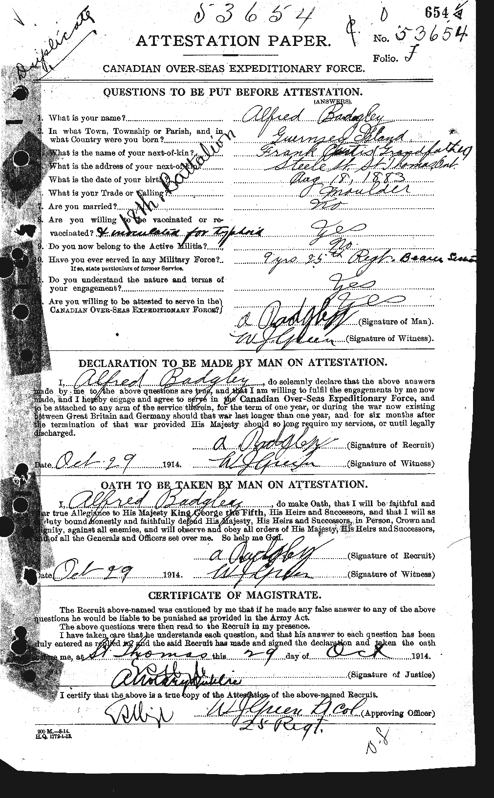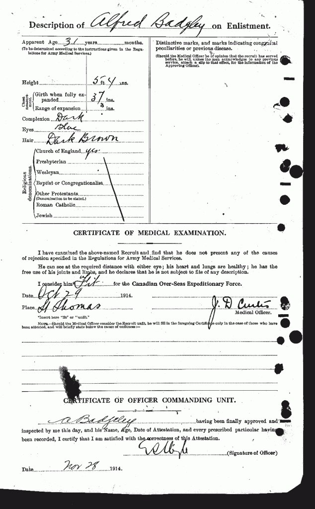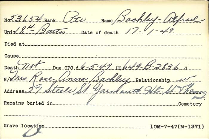 Family Search: Private Alfred Bachley was born on 18 August 1883, in Canada as the son of Harry Bachley and Alice Curtis. He married Rose Anna Bell on 1 January 1920, in Yarmouth Township, Elgin, Ontario, Canada. They were the parents of at least 1 daughter. He immigrated to Sarnia, Sarnia, Lambton, Ontario, Canada in 1913. He registered for military service in 1914. In 1914, at the age of 31, his occupation is listed as moulder in St. Thomas, Elgin, Ontario, Canada. He died on 17 January 1949, in St. Thomas, Elgin, Ontario, Canada, at the age of 65, and was buried in Elmdale Memorial Park Cemetery, St. Thomas, Elgin, Ontario, Canada.