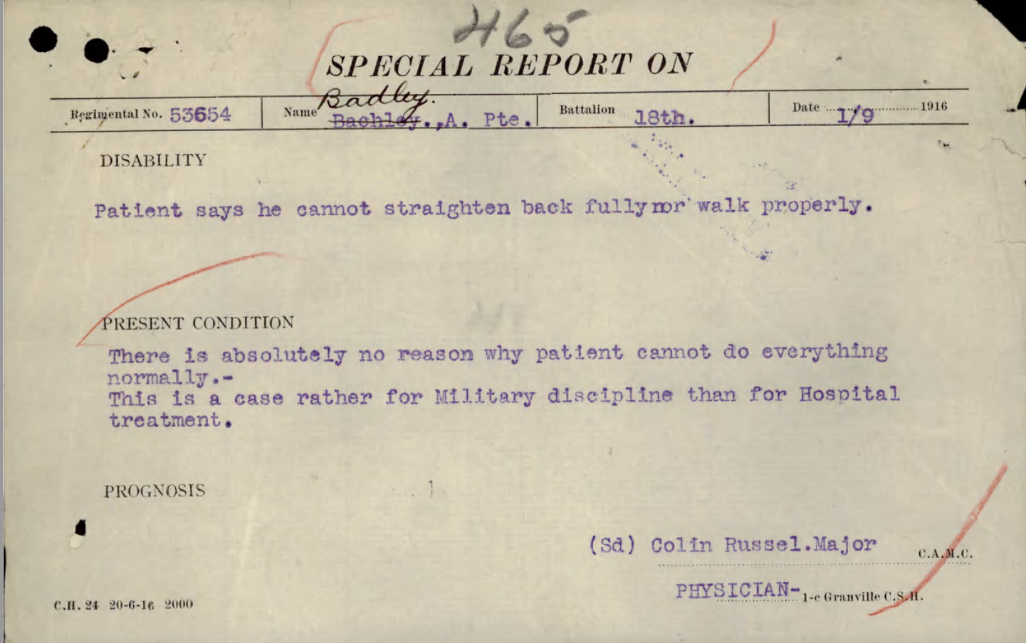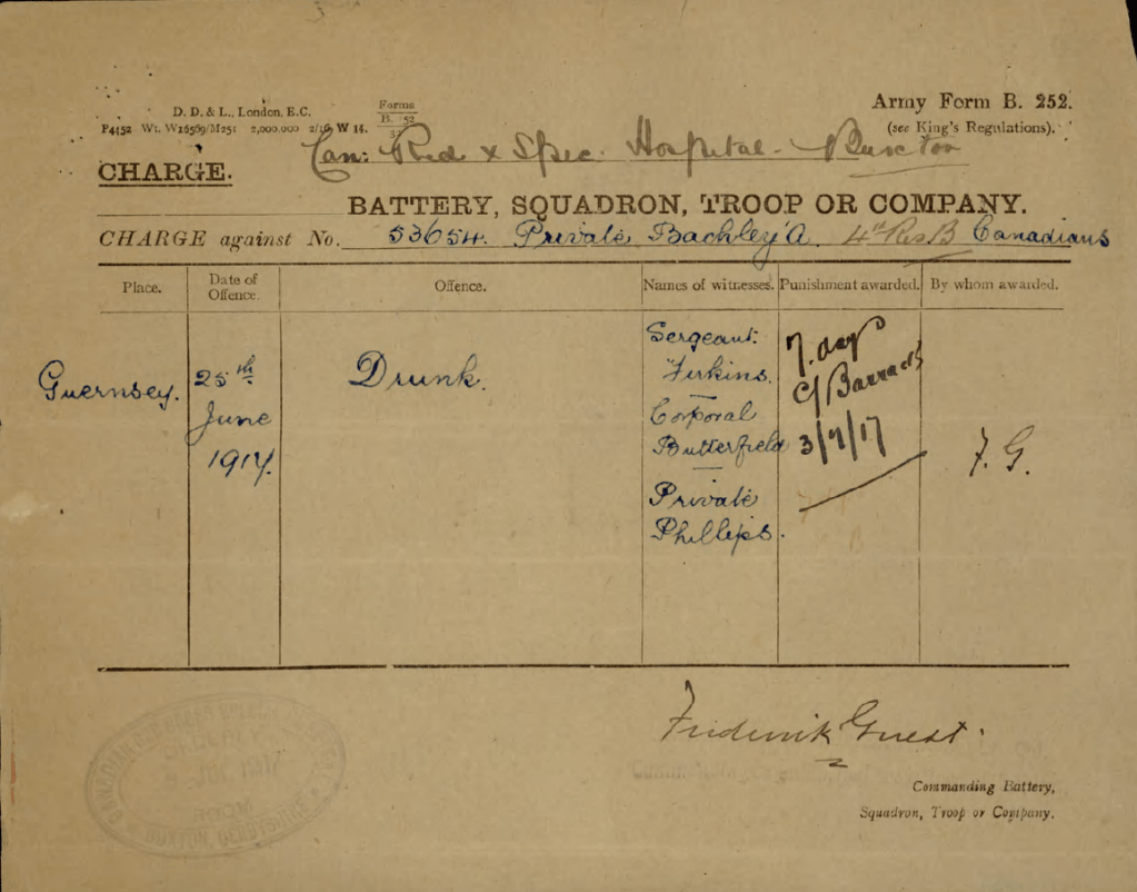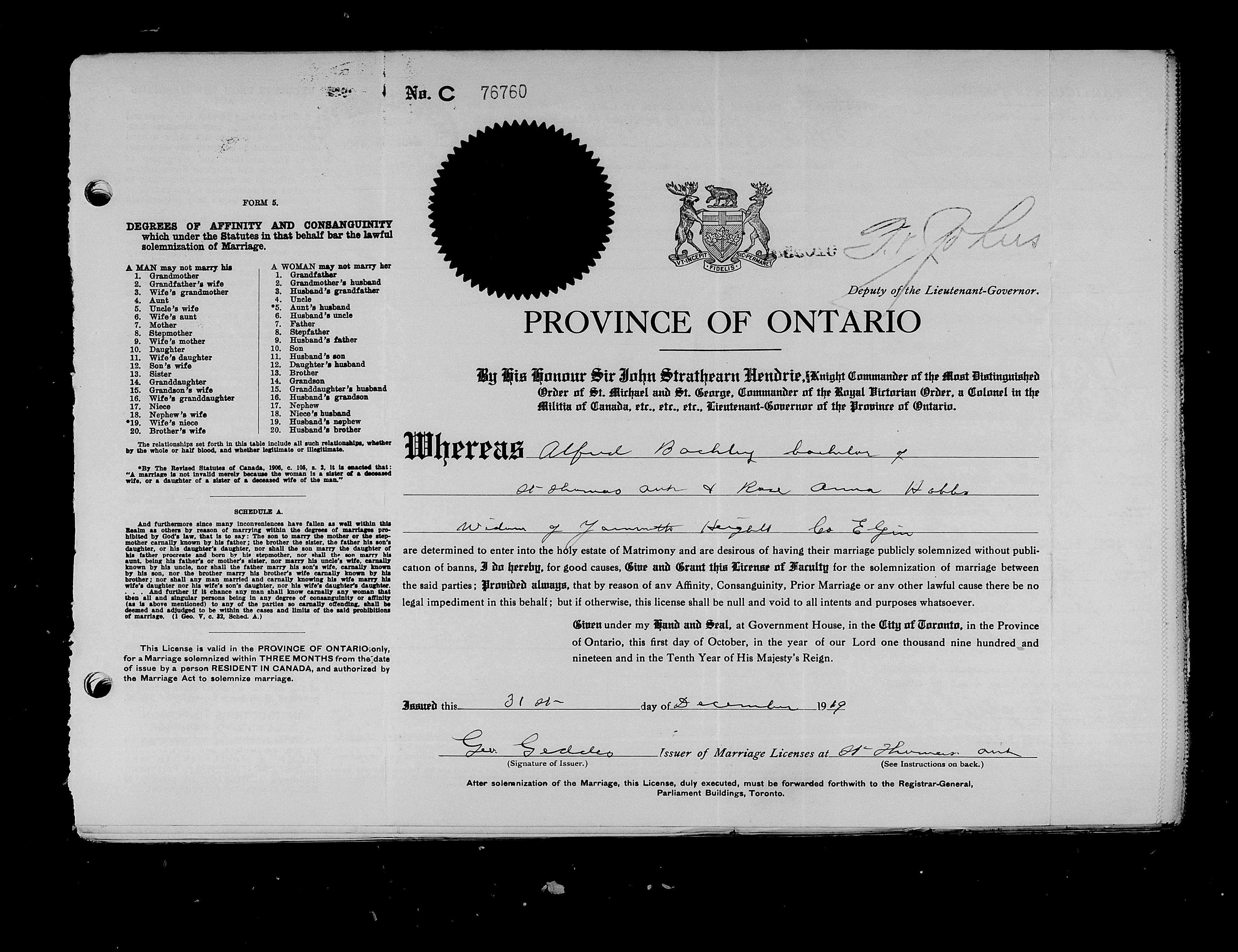 Family Search: Private Alfred Bachley was born on 18 August 1883, in Canada as the son of Harry Bachley and Alice Curtis. He married Rose Anna Bell on 1 January 1920, in Yarmouth Township, Elgin, Ontario, Canada. They were the parents of at least 1 daughter. He immigrated to Sarnia, Sarnia, Lambton, Ontario, Canada in 1913. He registered for military service in 1914. In 1914, at the age of 31, his occupation is listed as moulder in St. Thomas, Elgin, Ontario, Canada. He died on 17 January 1949, in St. Thomas, Elgin, Ontario, Canada, at the age of 65, and was buried in Elmdale Memorial Park Cemetery, St. Thomas, Elgin, Ontario, Canada.