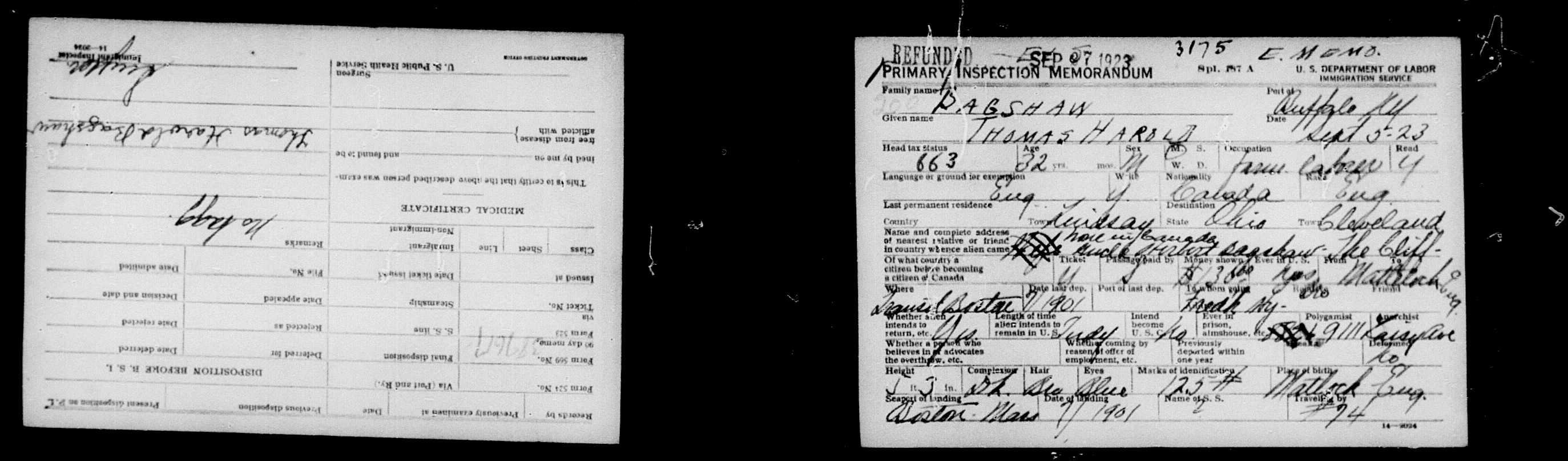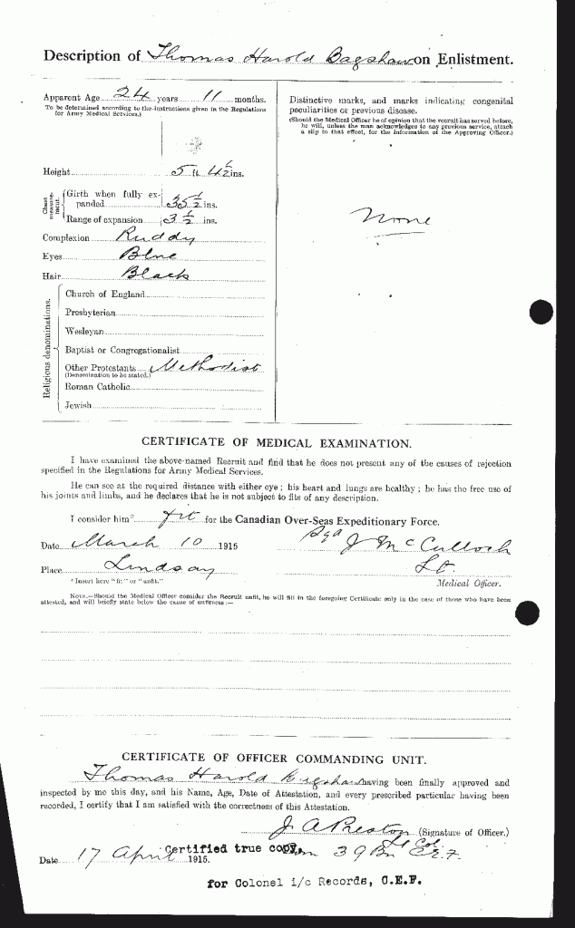 Family Search: When Thomas Harold Bagshaw was born on 19 March 1891, in Matlock, Derbyshire, England, United Kingdom, his father, Thomas Henry Bagshaw, was 24 and his mother, Mary M Briddon, was 27. He married Eliza Annie Towndrow in 1918, in Lancaster, Lancashire, England, United Kingdom. He immigrated to Canada in 1902 and lived in Cameron, Victoria, Ontario, Canada in 1920. He registered for military service in 1915. In 1915, at the age of 24, his occupation is listed as fireman. He died in 1966, in Lindsay, Victoria, Ontario, Canada, at the age of 75.