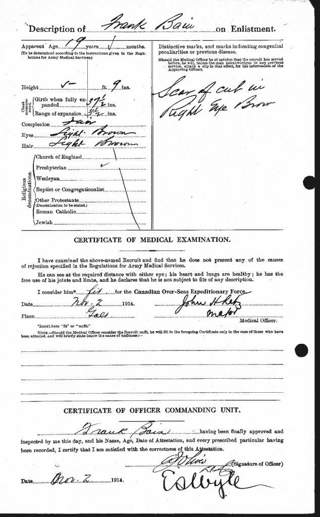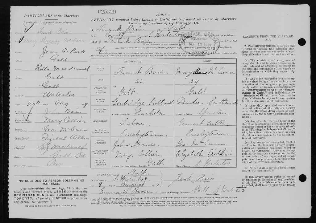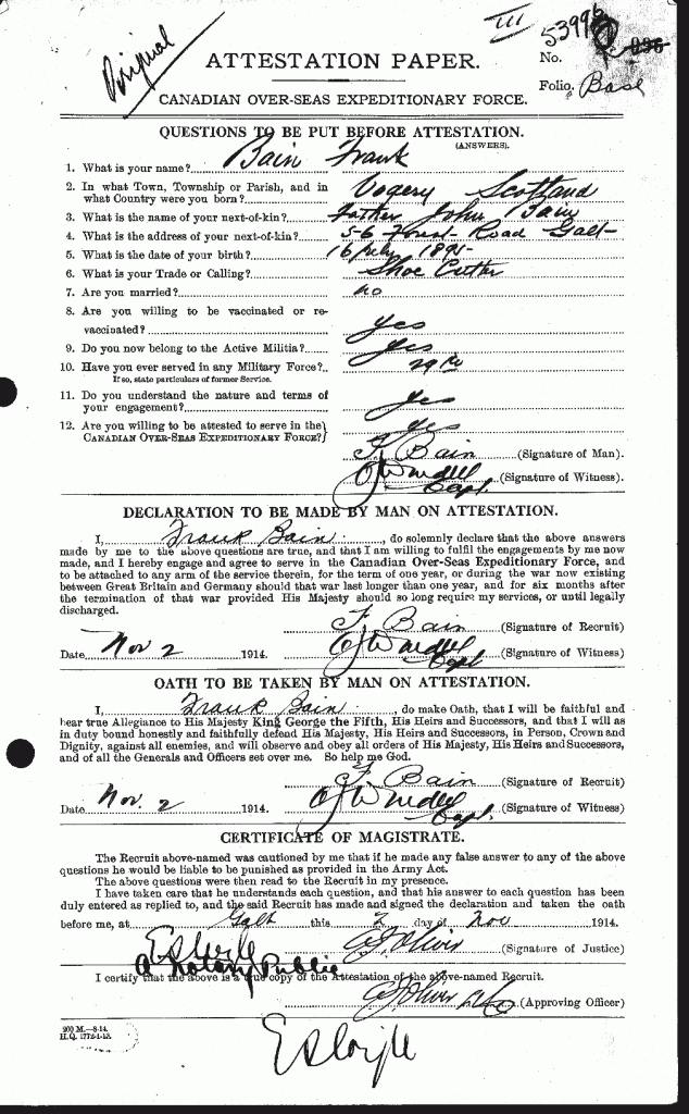 Family Search: Corporal Frank Bain was born on 16 July 1896, in Scotland, United Kingdom as the son of John Bain and Mary Collier. He married Mary McCann in 1919, in Galt, Waterloo, Ontario, Canada. They were the parents of at least 2 sons and 1 daughter. He registered for military service in 1914. In 1914, at the age of 18, his occupation is listed as shoe cutter. He died in 1979, in Cambridge, Waterloo, Ontario, Canada, at the age of 83, and was buried in Mount View Cemetery, Cambridge, Waterloo, Ontario, Canada.