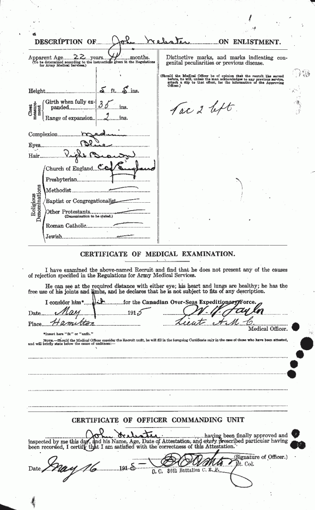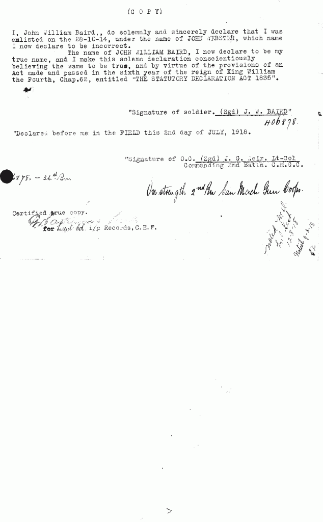 Source: John P. Sargent posted about the soldier in the 18th battalion Facebook Group. The soldier originally attested to the 21st Battalion and then deserted and then reattached it under an assumed name. More information at this link.