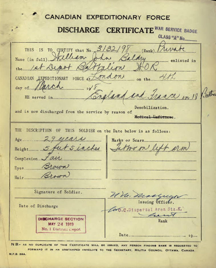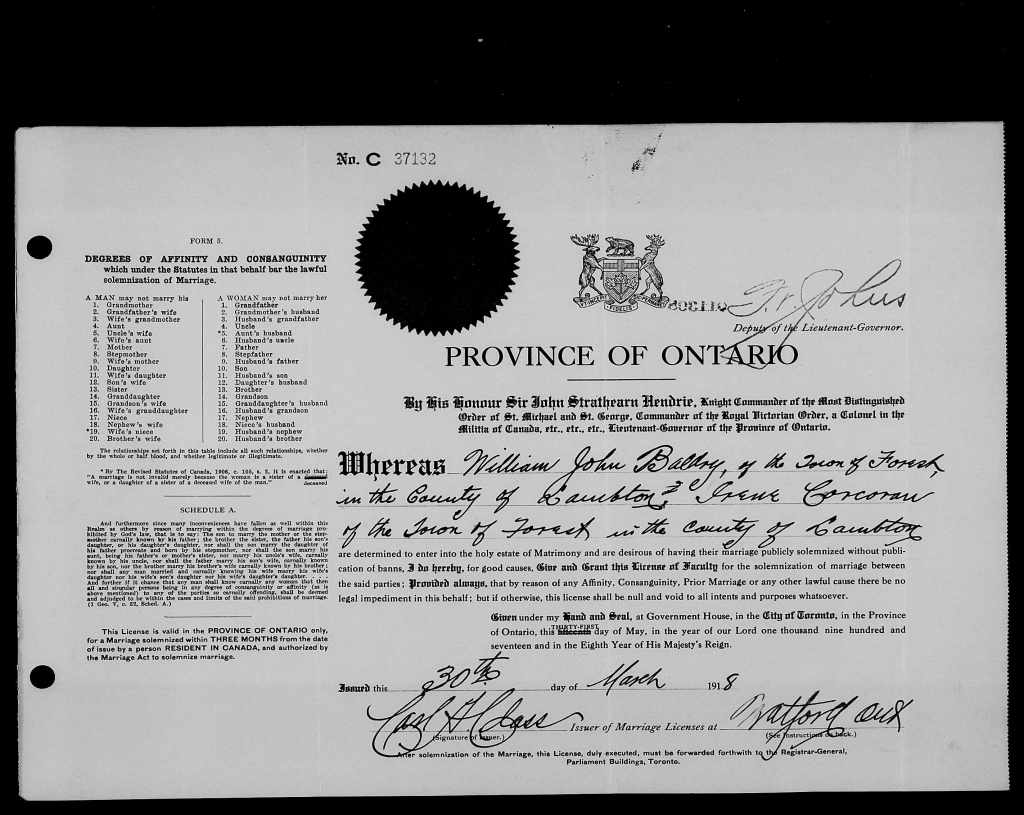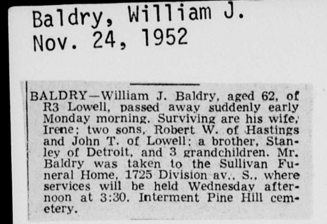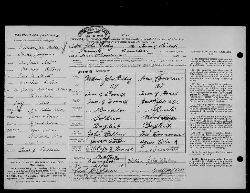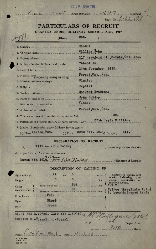 Family Search: When Private William John Baldry was born on 17 November 1890, in Forest, Lambton, Ontario, Canada, his father, John William Baldry, was 27 and his mother, Janet M. Stevens, was 23. He married Irene Cecelia Corcoran on 1 April 1918, in Warwick Township, Lambton, Ontario, Canada. They were the parents of at least 3 sons. He immigrated to Port Huron, St. Clair, Michigan, United States in 1926 and lived in Lowell Township, Kent, Michigan, United States in 1940 and Lowell, Lowell, Kent, Michigan, United States in 1950. He registered for military service in 1918. In 1918, at the age of 28, his occupation is listed as railway brakeman in Sarnia, Lambton, Ontario, Canada. He died on 24 November 1952, in Lowell, Kent, Michigan, United States, at the age of 62, and was buried in Pine Hill Cemetery, Kentwood, Kent, Michigan, United States.