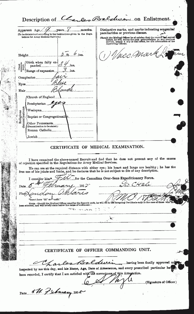 “Alias Charles Balfour. Trade listed as Machinist. DOB 26-5-95, born Edinburgh, Scotland. NOK Mrs. W. Steele. Enlisted 18th Battalion London 5-2-15 (age 19 years 8 months), lists 3 years service in 30th Wellington. 5 foot 6 inches. Blue eyes, blond hair. Presbyterian. Embarked with 18th Battalion Halifax, SS Grampion, 18-4-15. Went with 18th Battalion to France 18-9-15. GSW 1-4-17 bullet shattered right knee requiring amputation mid thigh. Returned aboard SS Missinabe 28-10-17, Quebec City, Quebec. Medical Board Quebec P.Q. recommends discharge, medically unfit. Discharged Toronto 14-1-18, Physically Unfit. Died 1947, buried Huxley Cemetery.