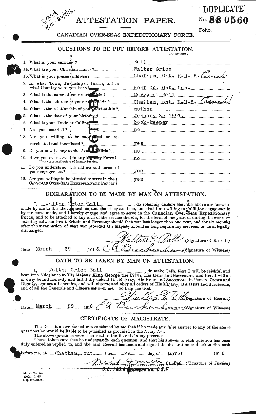 | September 27, 1916 | Signs “Particulars of Family of an Officer or Man Enlisted in the C.E.F. | He has no life insurance and his parent Mr. David and Mrs. Margaret Ball of R.R. No. 6 Chatham are both living. |
