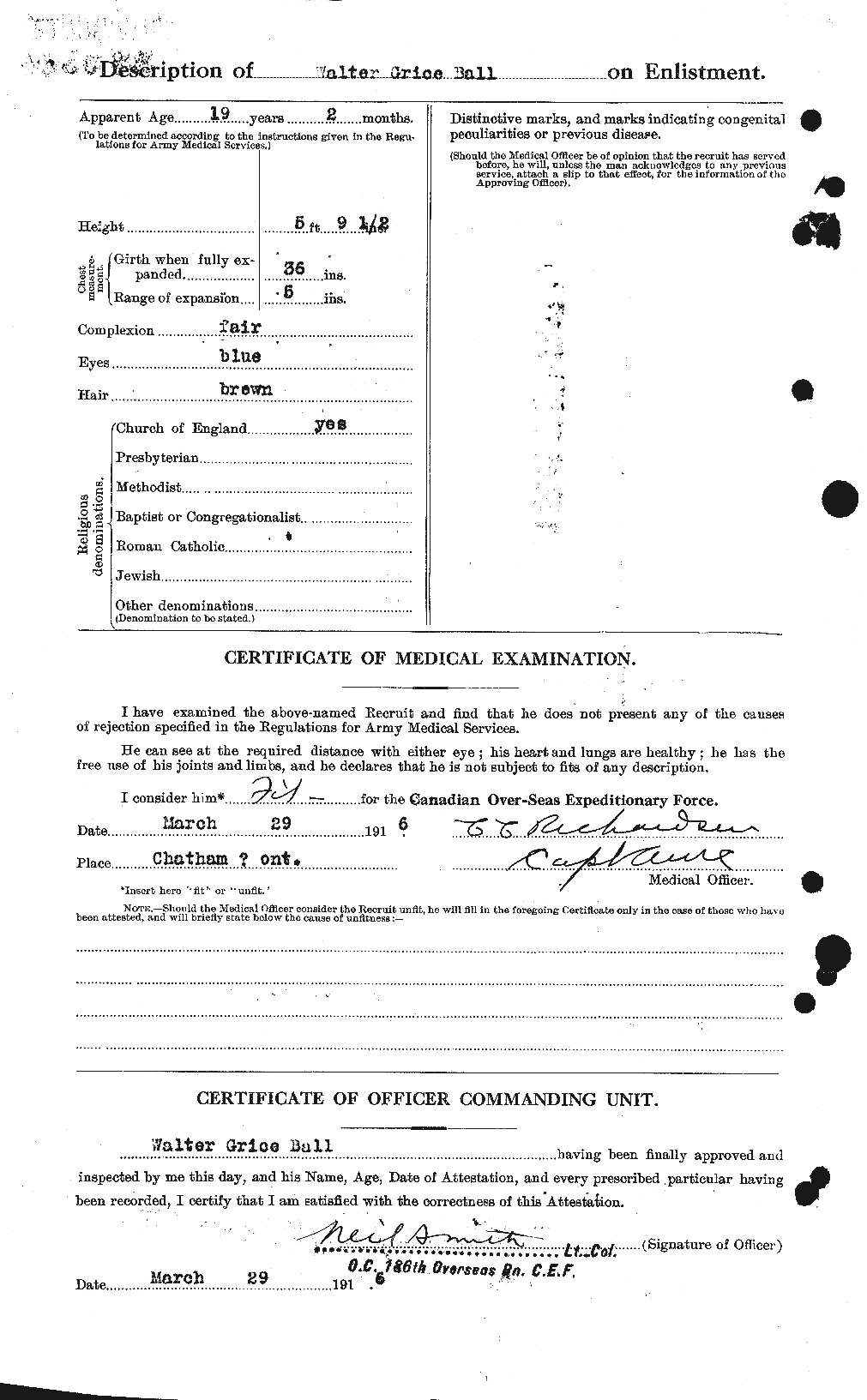 | March 29, 1916 | Enlists | Enlists with the 186th Overseas Battalion at Chatham, Ontario at the age of 19-years, 2-months. He was born on January 25, 1897. He is a bookkeeper and has no prior military experience. Naming his mother, Mrs. Margaret Ball of R.R. No. 6, Chatham as is next-of-kin. Standing 5’9.5” tall he has a fair complexion, blue eyes, and brown hair. His faith is designated as Church of England. His medical examination shows he weighs 131 lbs and indicates his height as 5’8”. Of note is that his first vaccination failed and he had a course of 3 inoculations to tetanus. Most soldiers only required 2 shots. |