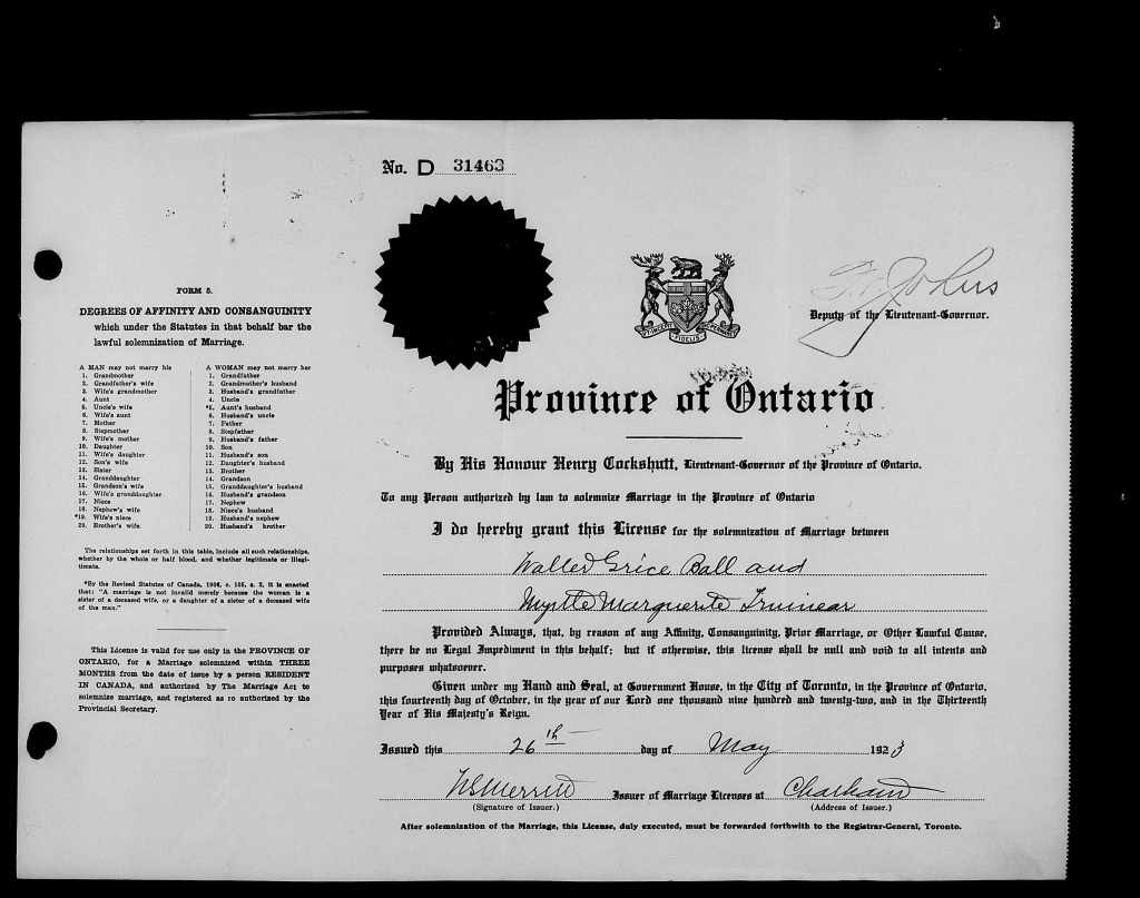 Family Search: When Private Walter Grice Ball was born on 25 February 1897, in Raleigh, Kent, Ontario, Canada, his father, David C. Ball, was 50 and his mother, Margaret Ellen Grice, was 44. He married Myrtle Marguerette Trinnear on 14 June 1923, in Chatham, Kent, Ontario, Canada. They were the parents of at least 3 sons and 1 daughter. He lived in Kent, Ontario, Canada for about 10 years and Chatham, Kent, Ontario, Canada in 1916. He registered for military service in 1916. In 1916, at the age of 19, his occupation is listed as bookkeeper in Chatham, Kent, Ontario, Canada. He died on 10 December 1953, in Chatham, Chatham-Kent, Ontario, Canada, at the age of 56, and was buried in Maple Leaf Cemetery, Chatham, Chatham-Kent, Ontario, Canada.