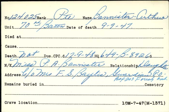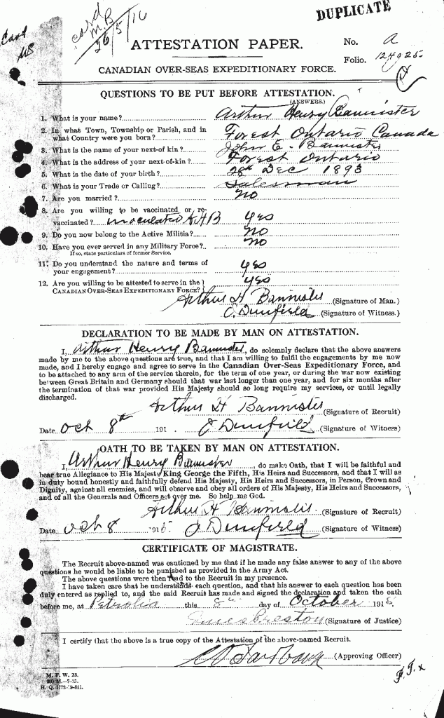 Pte. Arthur Bannister has arrivved home from England, after being in the hospital there for several months, suffering from wounds, which rended necessary the amputation of one leg. After a short stay here with his parents he will go to Toronto for futher treatment.