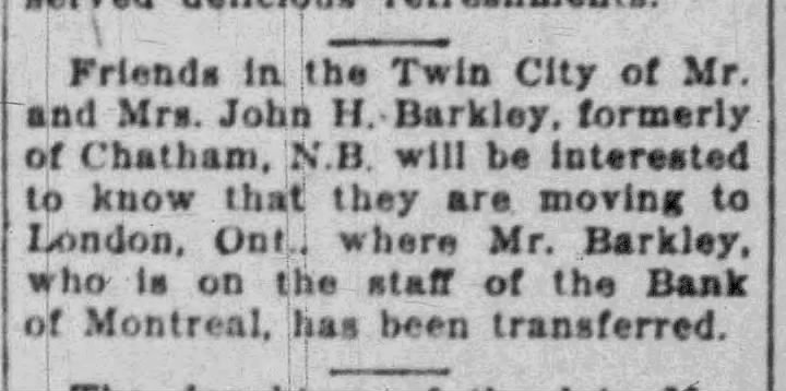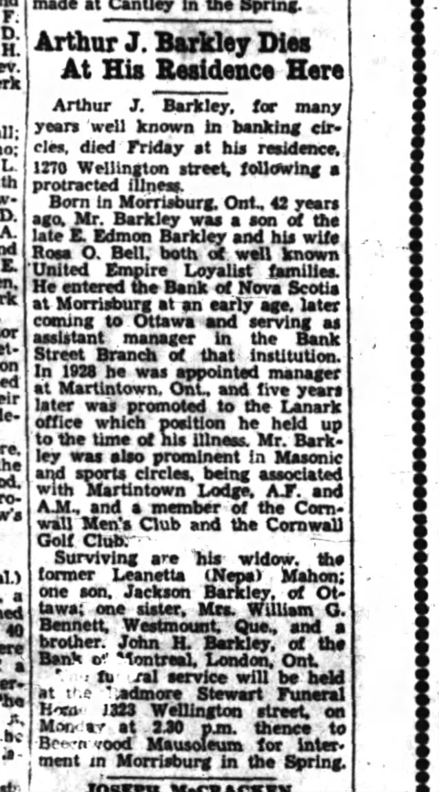 Family Search: When Lieutenant John Henry Barkley was born on 9 October 1890, in Williamsburgh Township, Stormont Dundas and Glengarry, Ontario, Canada, his father, Simon Edmund Barkley, was 31 and his mother, Rosa B. Bell, was 27. He had at least 1 daughter with Elsie Salome Feick. He lived in Chatham, Northumberland, New Brunswick, Canada in 1931. He registered for military service in 1916. In 1927, at the age of 37, his occupation is listed as bank clerk, bank of montreal in London, Ontario, Canada. He died on 10 October 1973, in London, Ontario, Canada, at the age of 83, and was buried in Woodland Cemetery, London, Ontario, Canada.