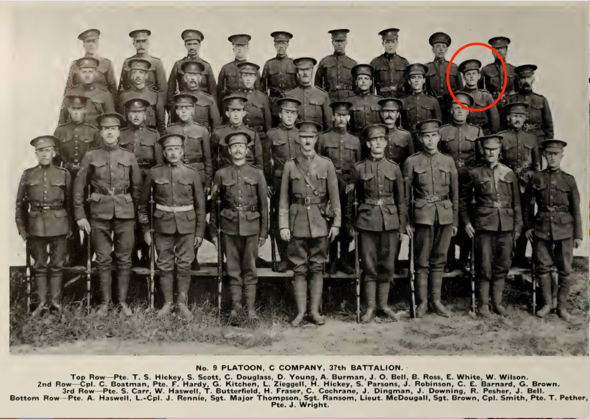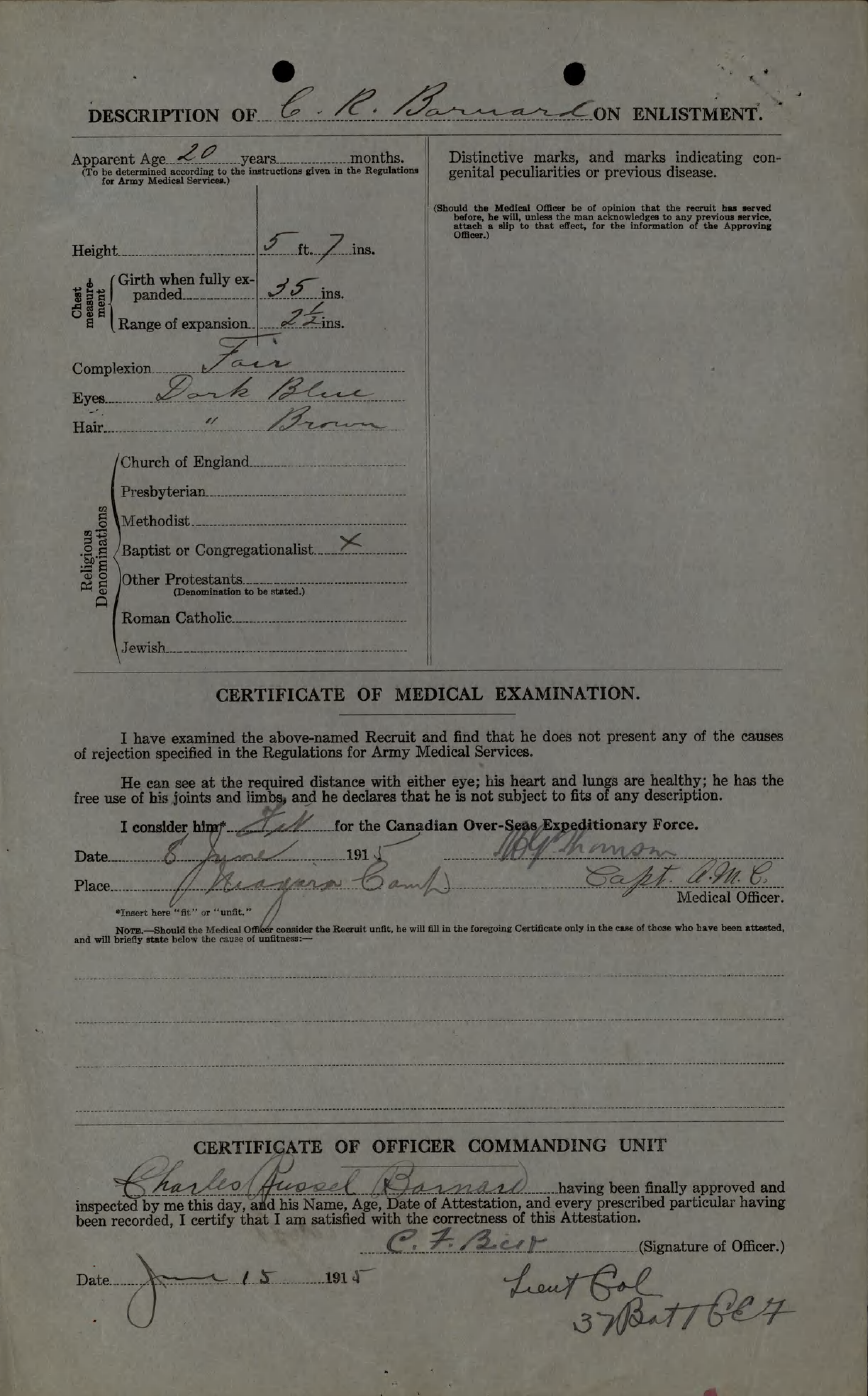 He joined the 37th Battalion at Niagara-on-the-Lake, Ontario (Niagara Camp) on 11 June 1915. He showed is trade or calling as a student and was assessed the apparent age of 20 years old. He was 4 years younger.