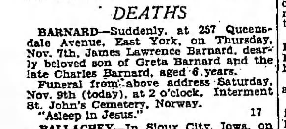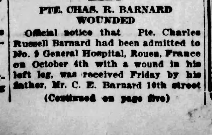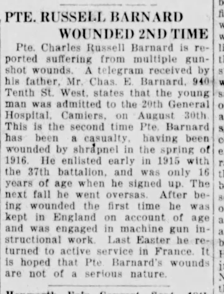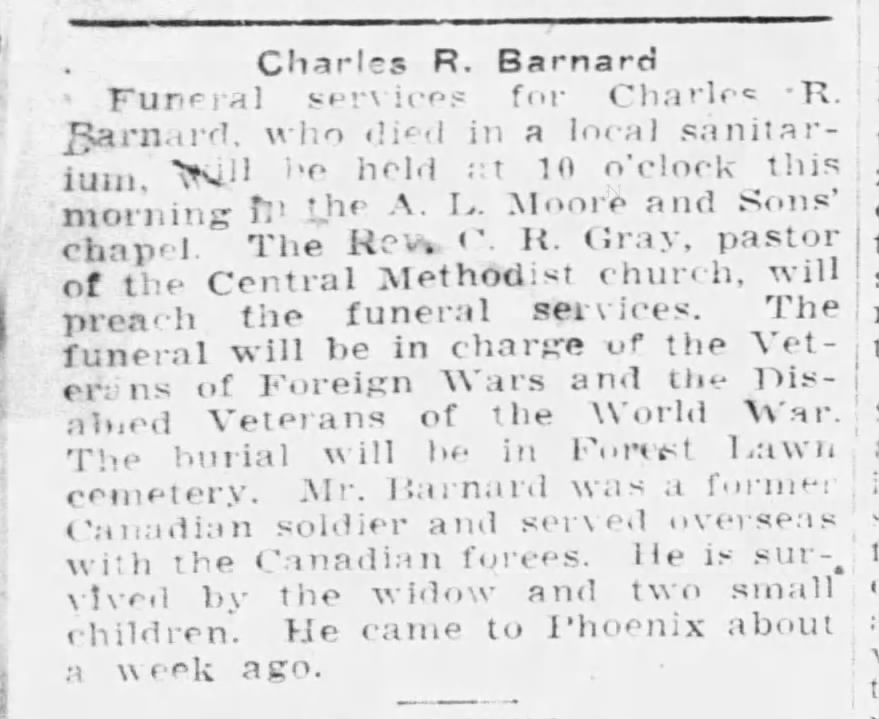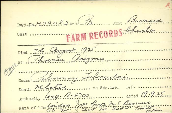 Family Search: When Private Charles Russell Barnard was born on 6 January 1899, in Derby Township, Grey, Ontario, Canada, his father, Charles Emmanuel Barnard, was 39 and his mother, Esther Jane McClean, was 33. He married Greta Marie Emma Shaw on 8 June 1921, in York, Ontario, Canada. They were the parents of at least 1 son. He lived in Owen Sound, Grey, Ontario, Canada in 1915. He registered for military service in 1915. In 1915, at the age of 16, his occupation is listed as student in Owen Sound, Grey, Ontario, Canada. He died on 7 August 1925, in Phoenix, Maricopa, Arizona, United States, at the age of 26, and was buried in Greenwood Memory Lawn Cemetery, Phoenix, Maricopa, Arizona, United States.