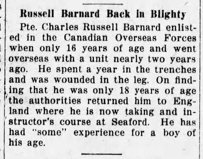 It was discovered he was a minor some time around Arpil 1917, and he was under consideration for a discharge but they posted him to the Canadian Machine Gun Depot for training and to await his majority.